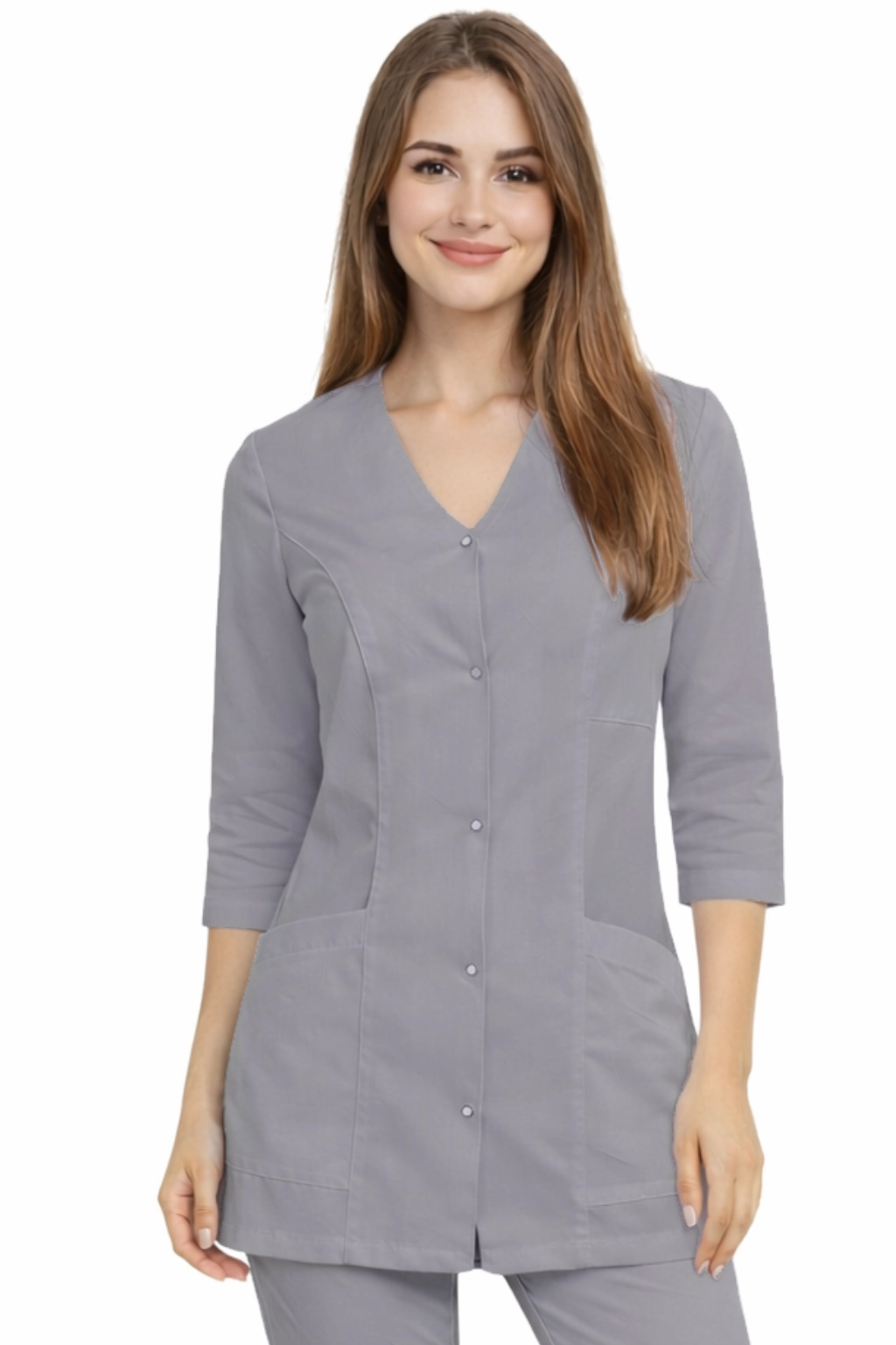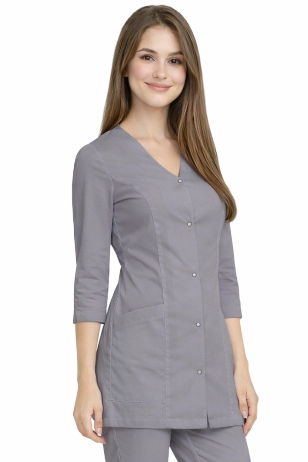 Naisten CASUAL PREMIUM -hoitajantakki tummanharmaana on elegantti ja toimiva ehdotus naisille, jotka työskentelevät lääketieteellisellä, kosmeettisella ja kauneuden alalla. Malli yhdistää ammattimaisen ulkonäön ja käyttömukavuuden, minkä vuoksi se soveltuu erinomaisesti sekä lääkärin toimistoissa, esteettisen lääketieteen klinikoissa että kosmetologisissa salongeissa, SPA:ssa tai vastaanotossa.