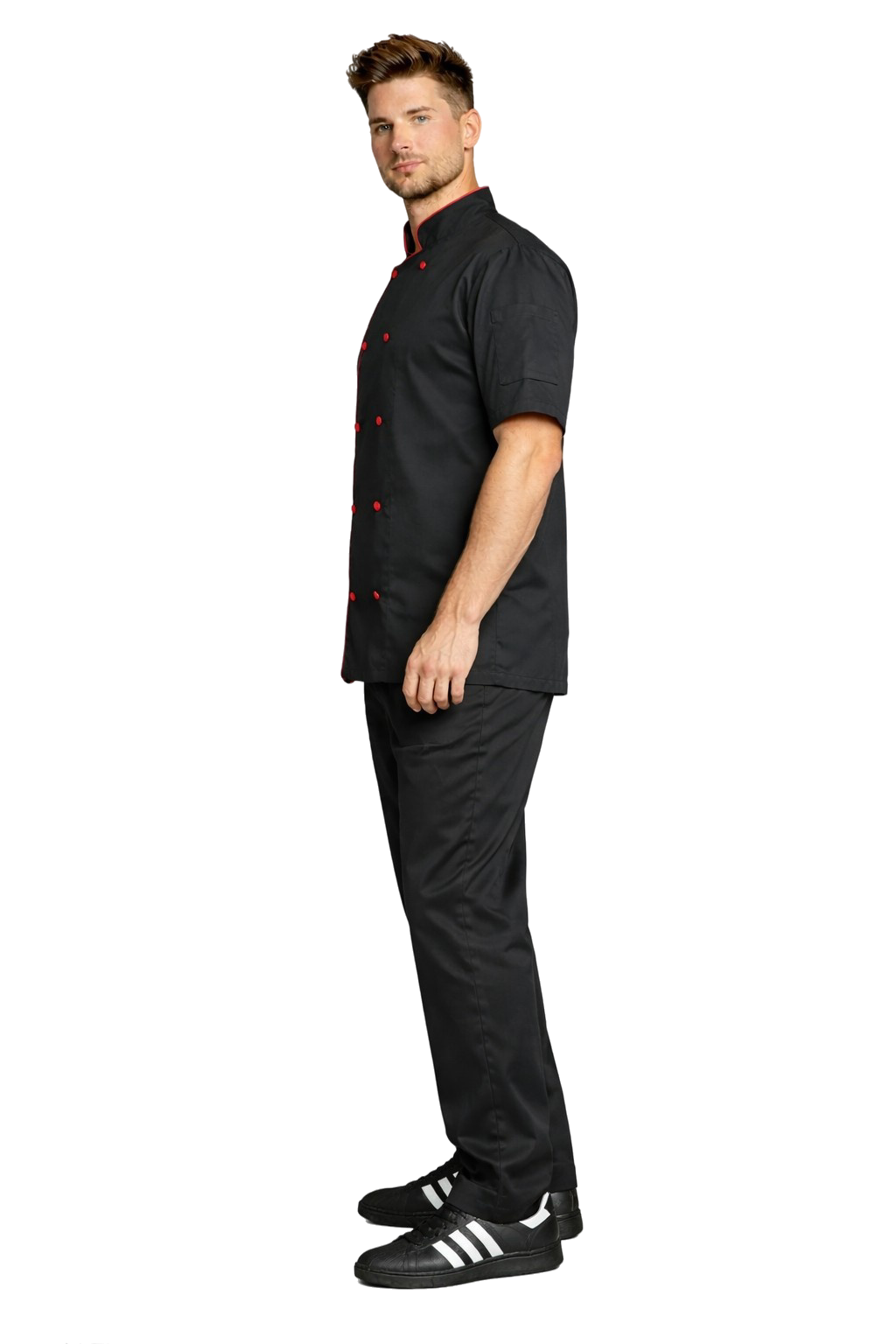 Moderni leikkaus tekee housuista tyylikkään osan ammattimaista gastronomista univormua.