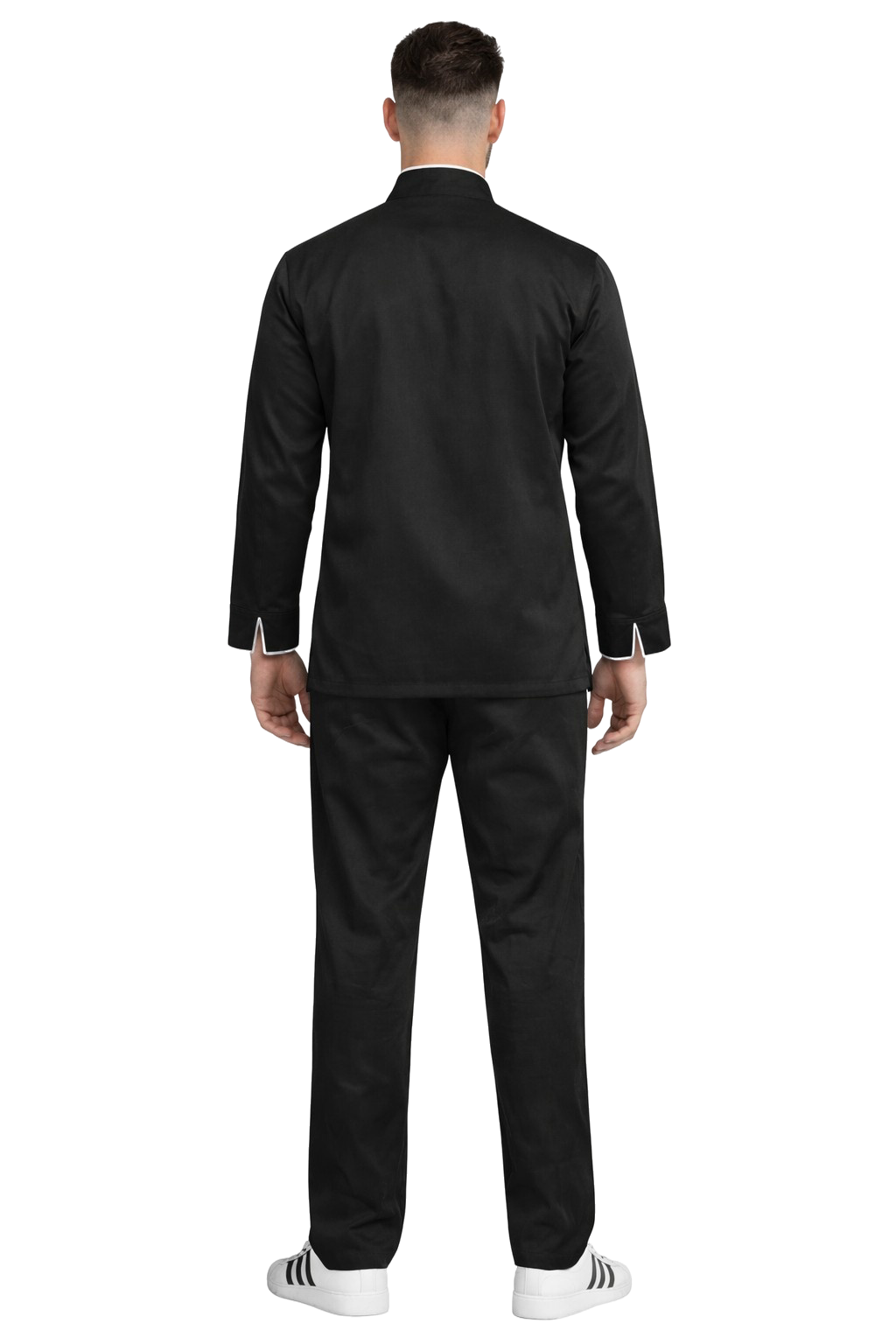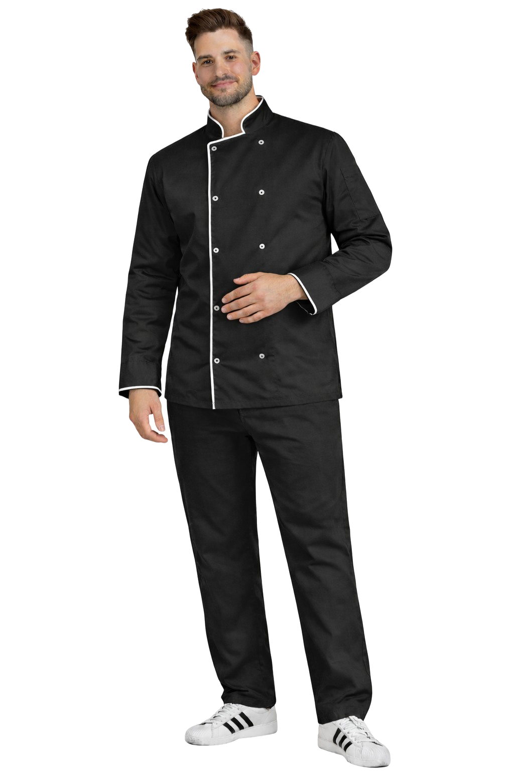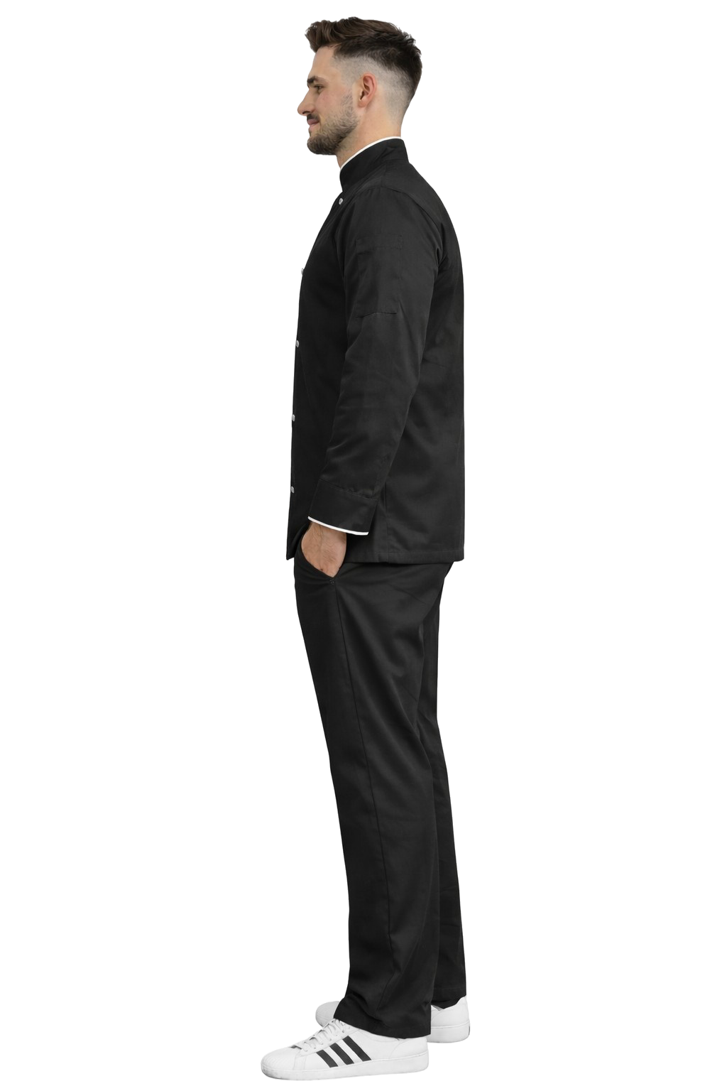 Kokin univormu - ammattimainen gastronominen setti, jossa on napitettava etupuoli, pitkät hihat.