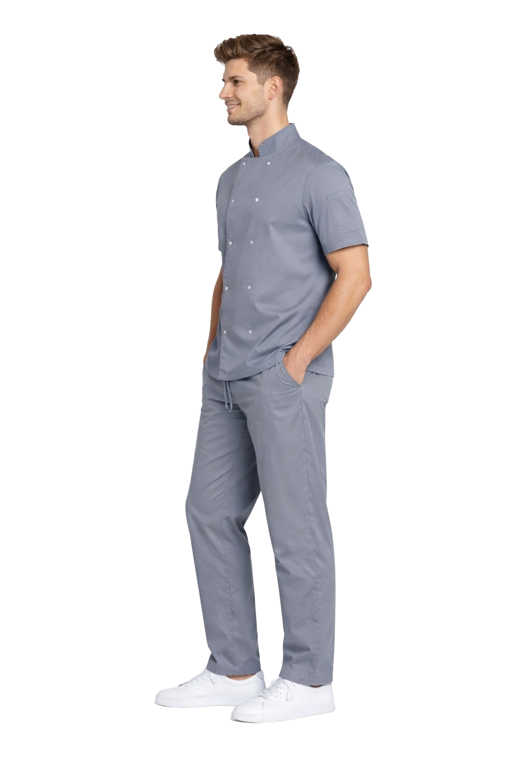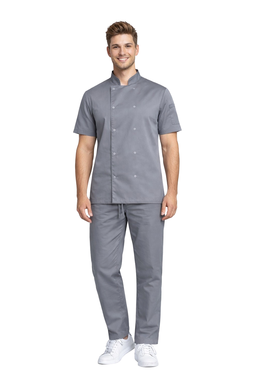 Elastaanin sisältävän kankaan käytön ansiosta setti tarjoaa korkean työmukavuuden, esteettisen ulkonäön ja täyden liikkumisen vapauden, mikä on ratkaisevan tärkeää dynaamisessa keittiöympäristössä.