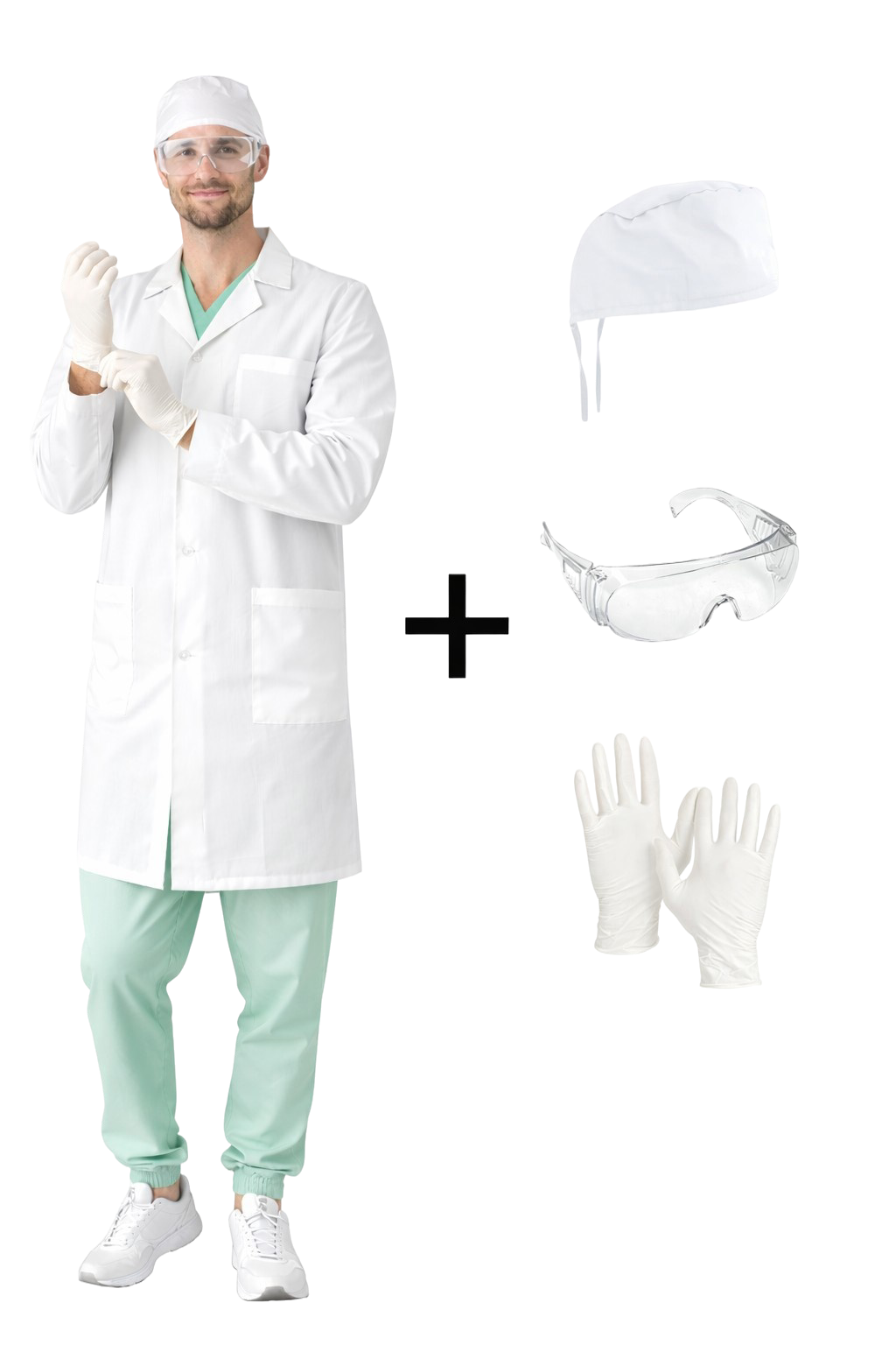 Hintaan sisältyy valkoinen lääketieteellinen esiliina, suojalasit, lääketieteellinen lippis, valkoiset käsineet. Sängyssä on suojaava toiminto. Se on hyödyllinen tulevalle lääkärille aloituspakkauksena lääketieteellisen koulun aloittamisen jälkeen.