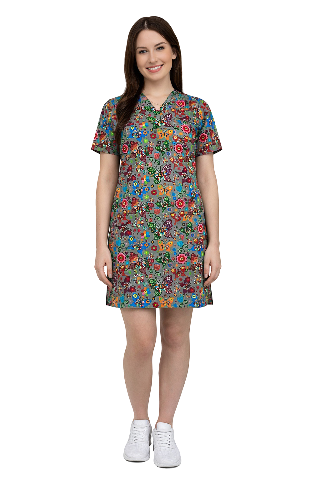 Meidän mekkomme on suunnattu klinikoilla, sairaaloissa, päiväkodeissa, lääkärien vastaanotoilla ja kauneus- tai kampaamoissa työskenteleville naisille. Kyseessä on erittäin miellyttävä leikkaus yksinkertaisesta, klassisesta mekosta, joka on koristeltu mielenkiintoisilla värikkäillä kuvioilla. Mekko on kätevästi solmittavissa vyötäröltä, mikä antaa jokaiselle naiselle mahdollisuuden sovittaa mekko vartalolleen.