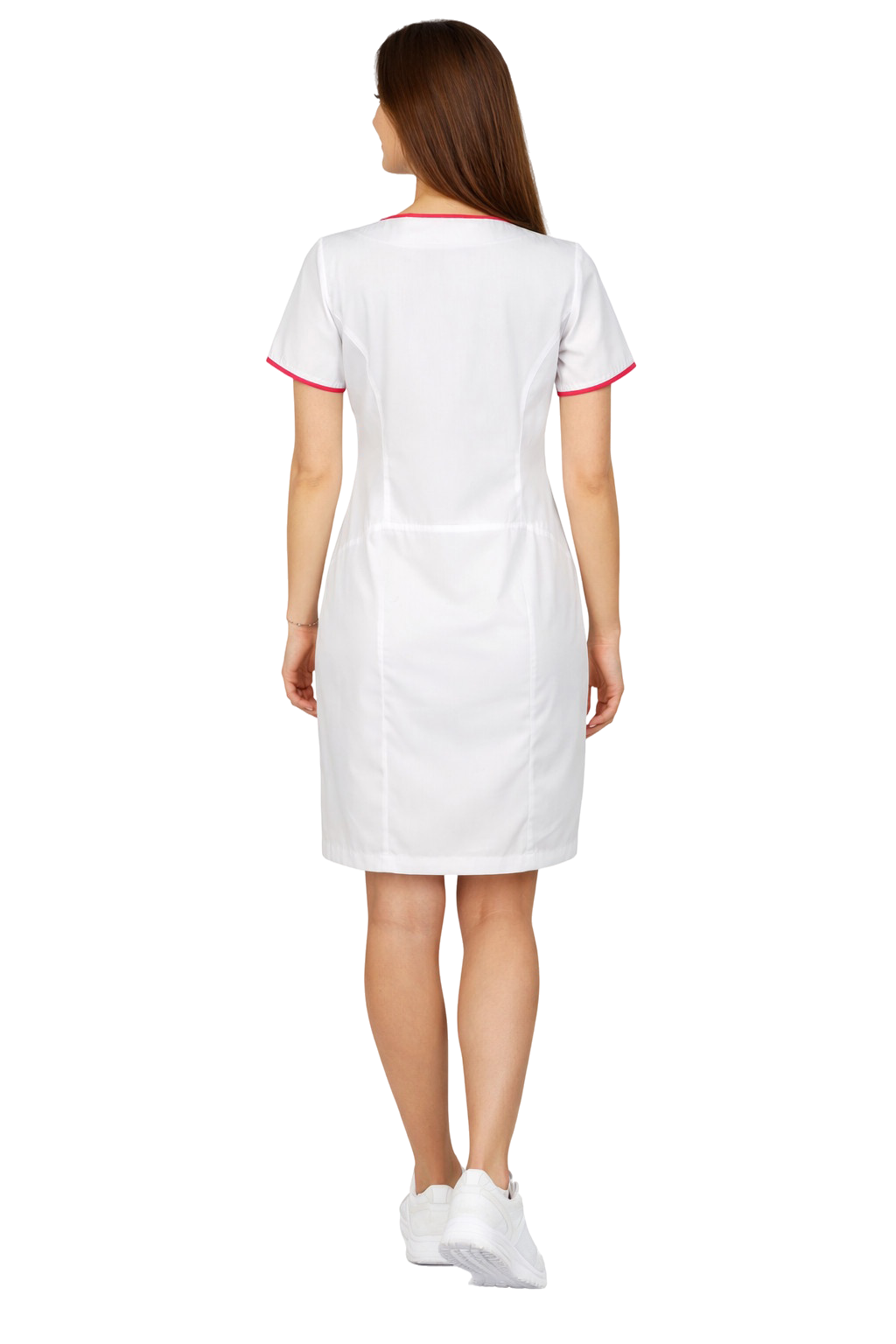 Lääkintä- ja kauneusmekko vetoketjulla, valkoinen amaranttireunuksella, lyhyet hihat