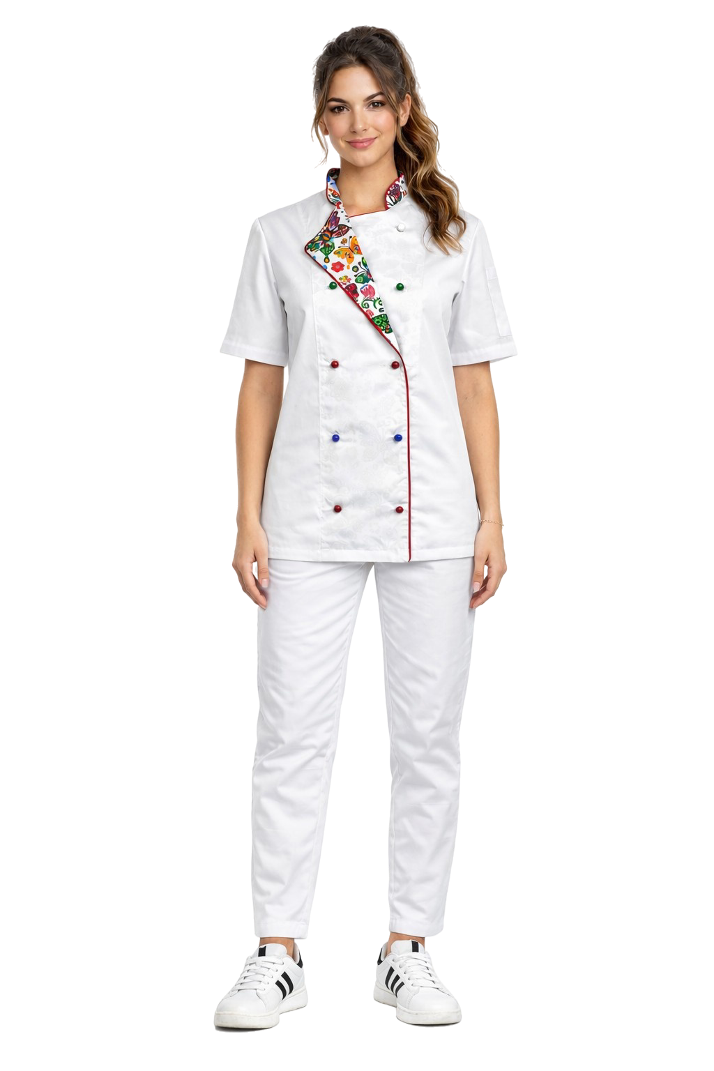 Takki on suunniteltu naisellinen muoto, joka korostaa kauniisti vartaloa ja tekee työskentelystäsi esteettisen. Lyhyet hihat ja kevyt, hengittävä kangas takaavat mukavuuden, jopa keittiön korkeissa lämpötiloissa.