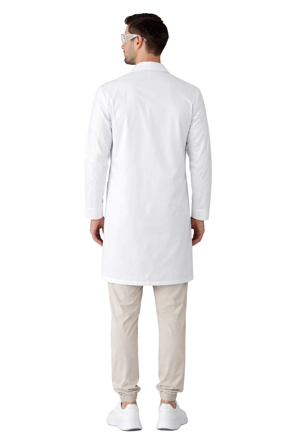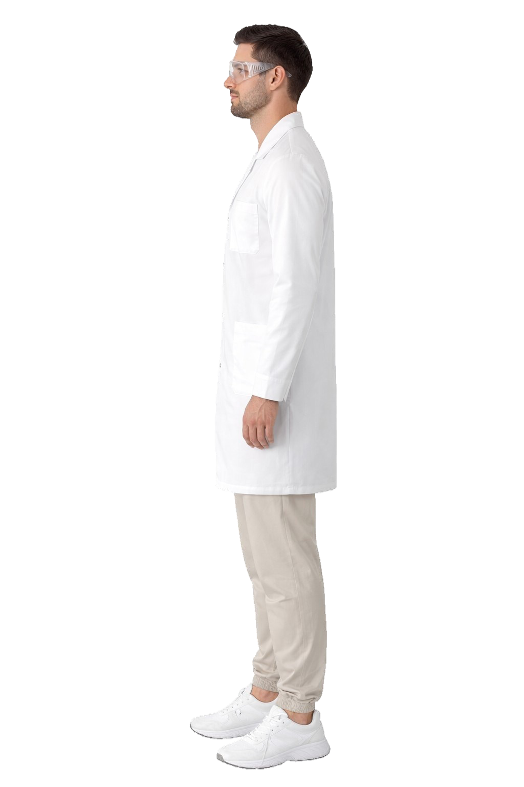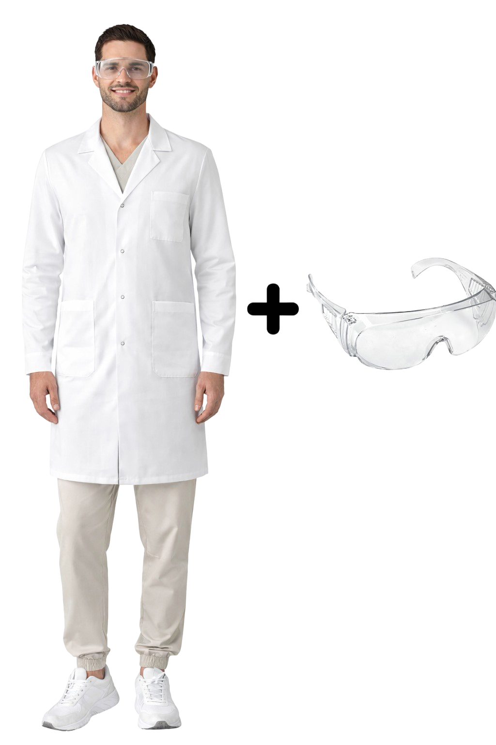 Miesten laboratoriokokoelma - napilla suljettava lääketieteellinen takki ja roiskeilta suojaavat lasit