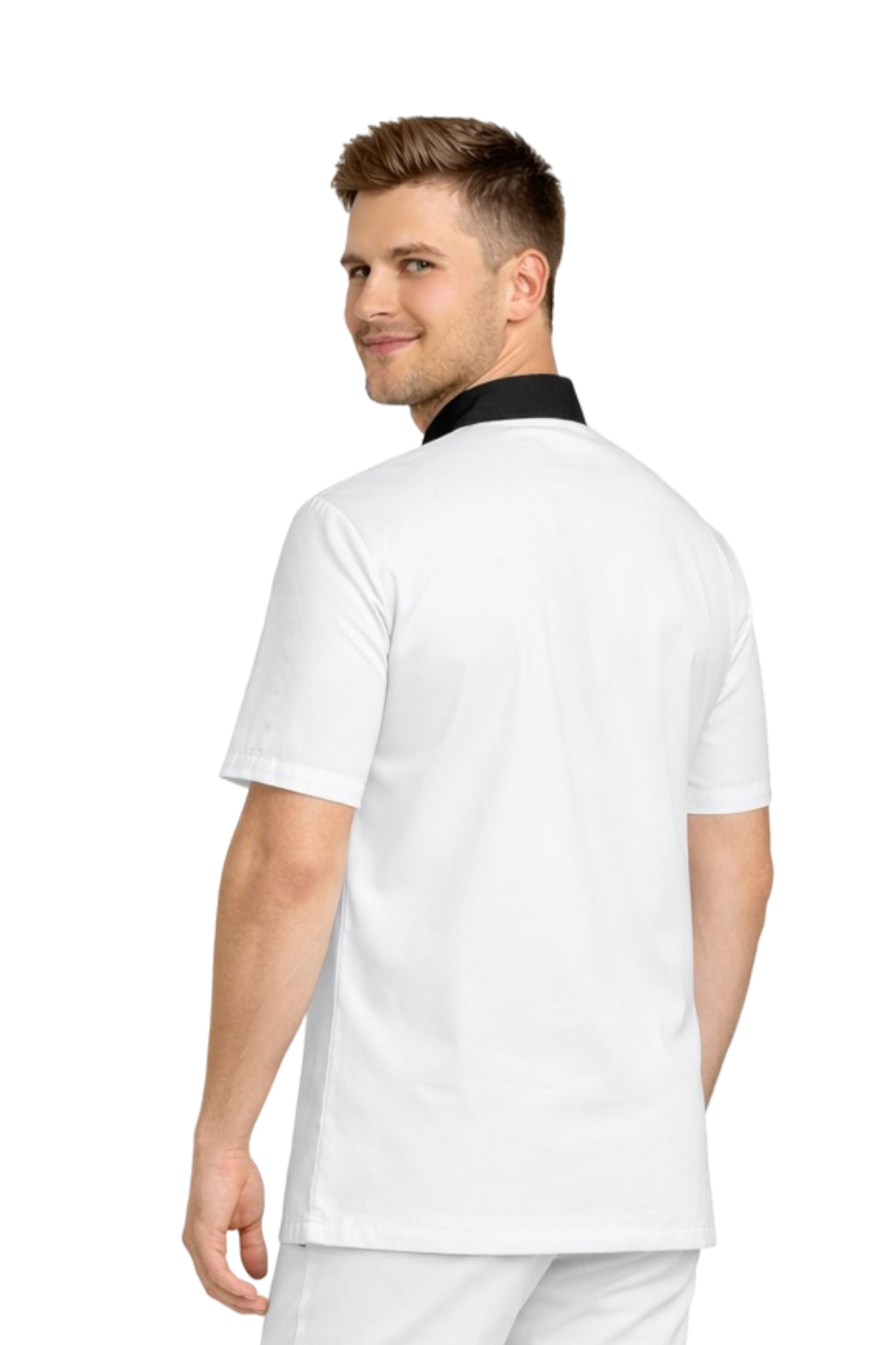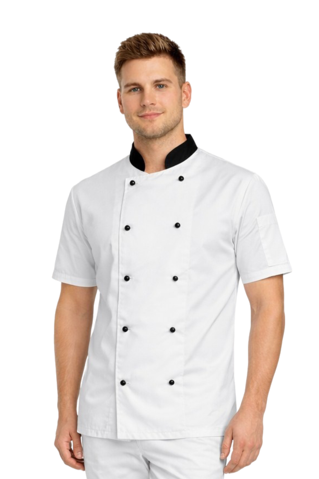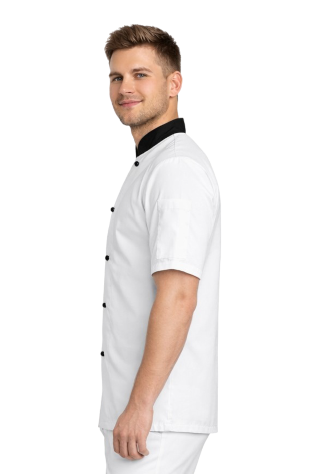 Miesten valkoinen kokkijakku mustalla kauluksella ja napilla – gastronominen takki, lyhyet hihat.