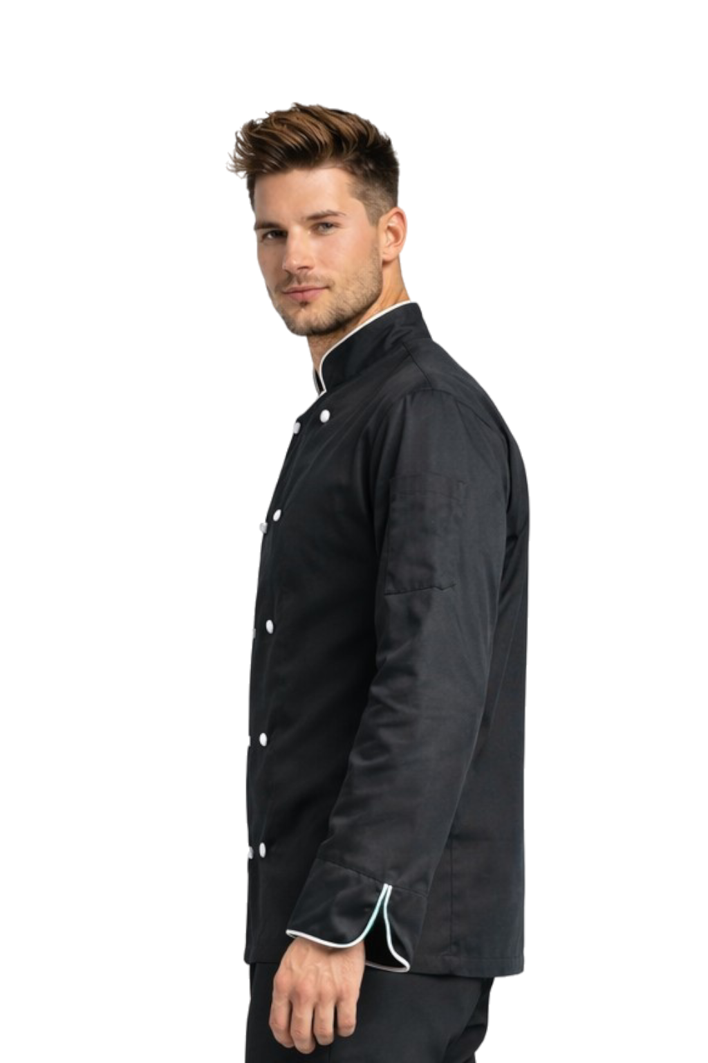 Ammattimainen miesten musta kokkipaita valkoisella putkireunalla on korkealaatuinen gastronominen kitteli, joka on luotu ajatellen kokkeja, keittiöapulaisia ​​ja keittiömestareita. Tyylikäs ulkonäkö yhdistettynä toiminnallisuuteen tekee paidasta erinomaisen valinnan ravintoloihin, hotelleihin ja catering-yrityksiin.