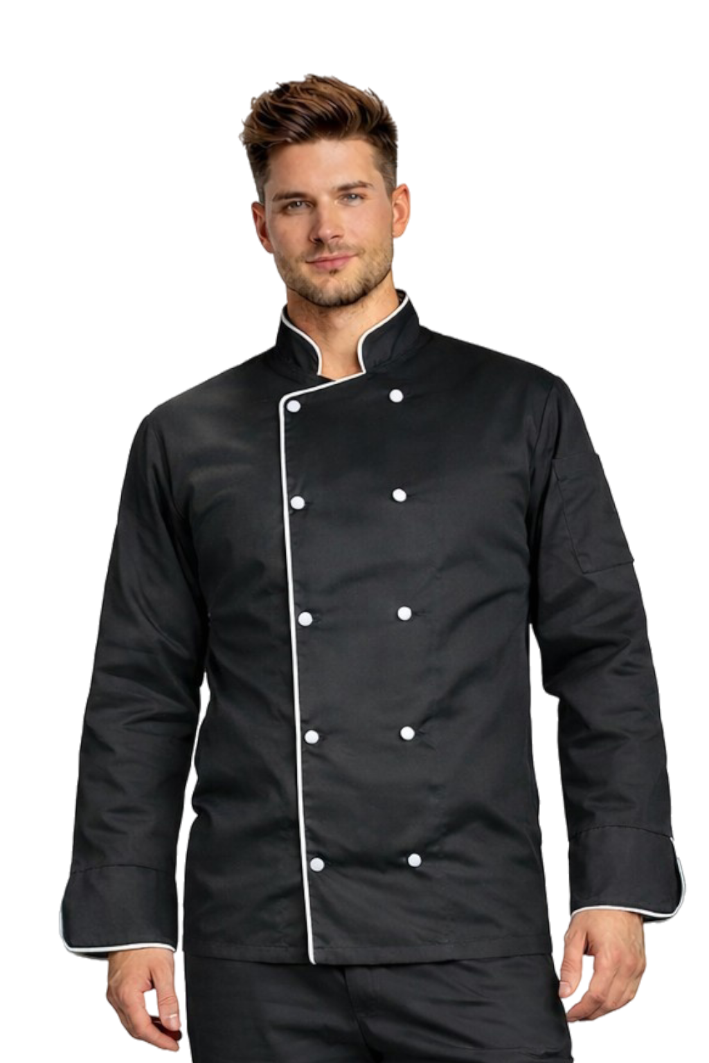 Musta miesten keittiöliivi valkoisella reunuksella – gastronominen takki, pitkät hihat