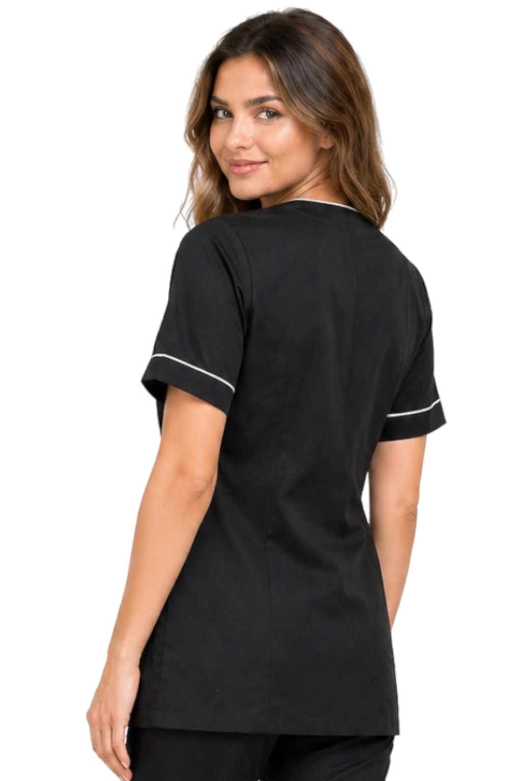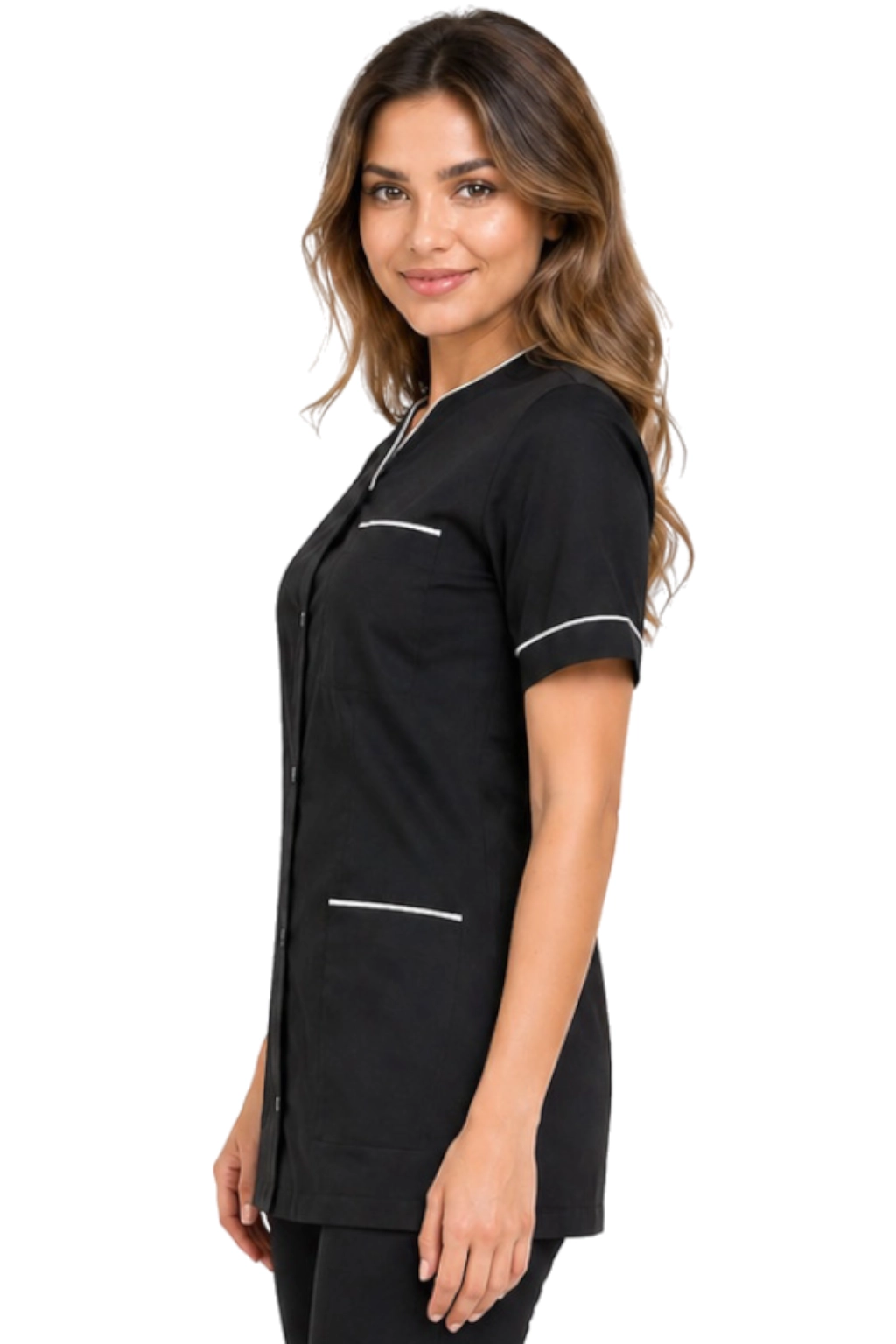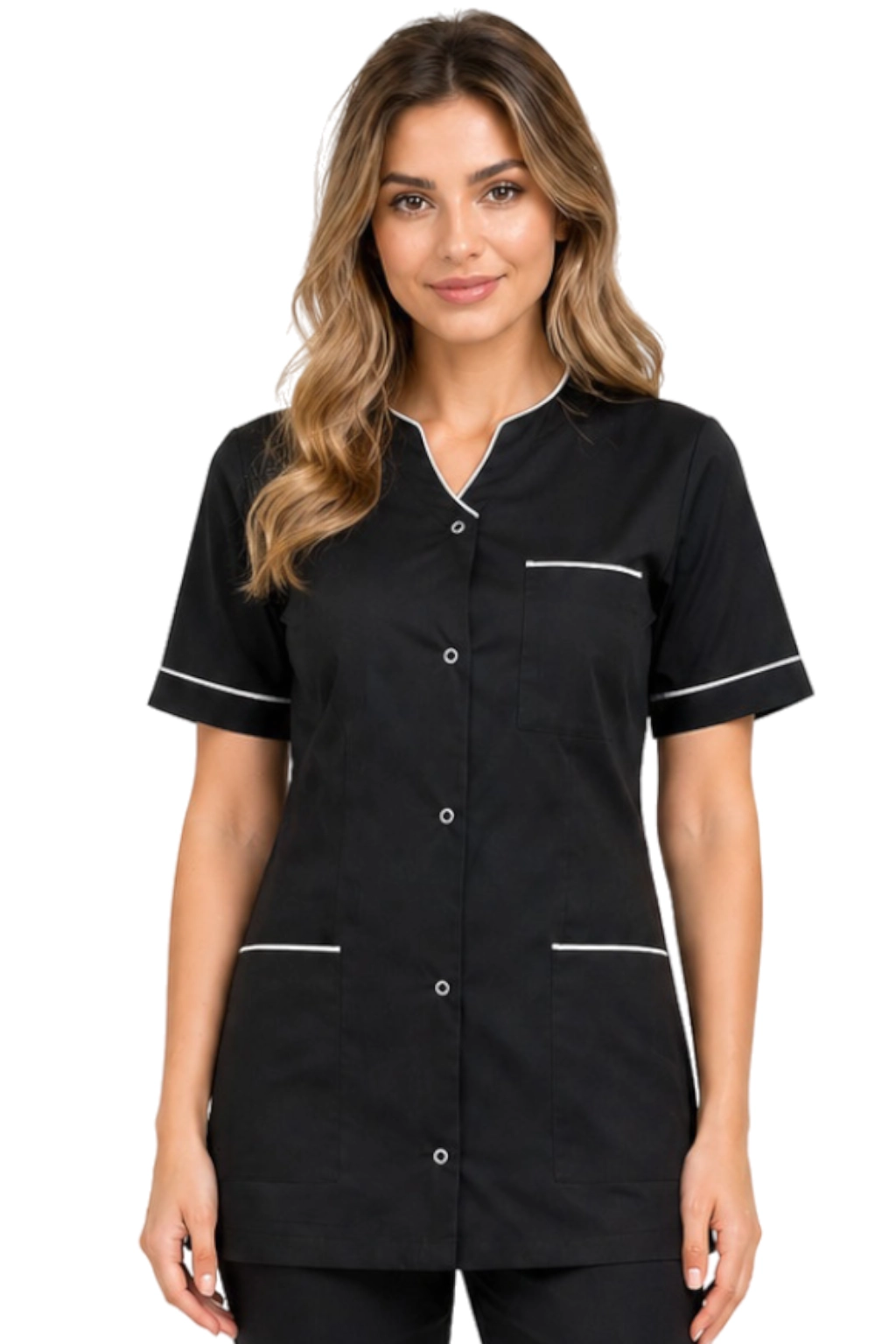Mustat naisten lääketieteellinen kosmetiikkatakki valkoisella reunuksella