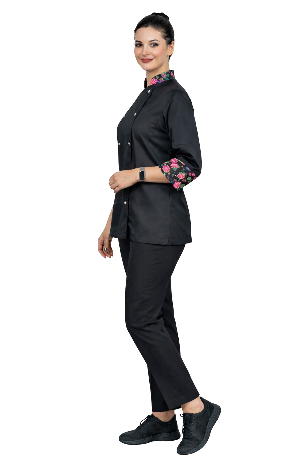 Kokkipaita on suunniteltu naisten istuvaan muotoon, joka korostaa vartaloa rajoittamatta liikkumisvapautta. 3/4-hihainen paita on käytännöllinen ratkaisu keittiötyössä – se tarjoaa mukavuutta ja esteettisen ulkonäön.