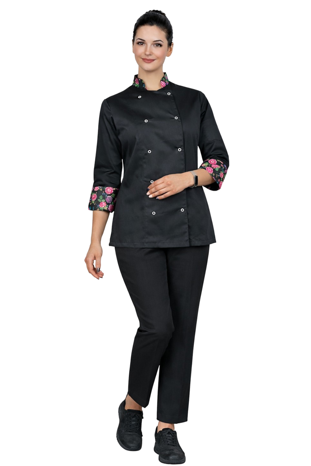 Naisten kokki-asusteisiin kuuluu vyötärömallinen takki 3/4-hihalla sekä modernit jogger-tyyliset housut, jotka yhdistävät ammattimaisuuden ja sporttisen mukavuuden. Setti on suunniteltu naisille, jotka työskentelevät ravintola-alalla, ja arvostavat mukavuutta, kestävyyttä ja naisellista tyyliä työpaikalla.