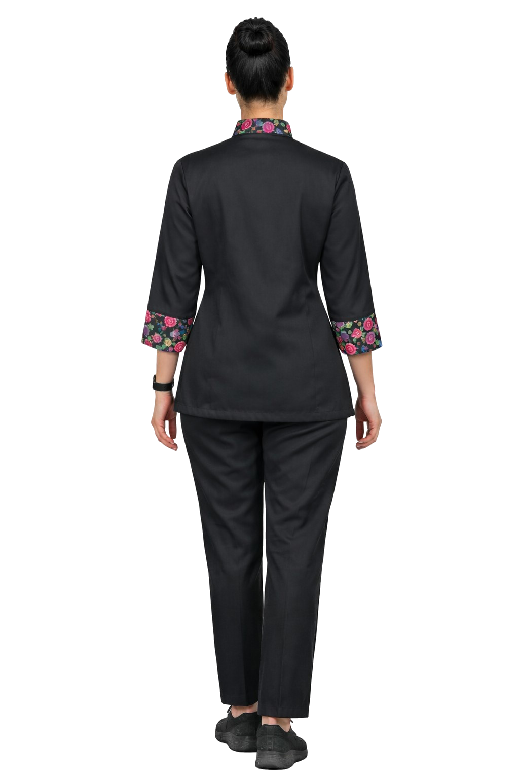 Naisten kokkisetti 3/4-hihalla ja klassiset mustat housut