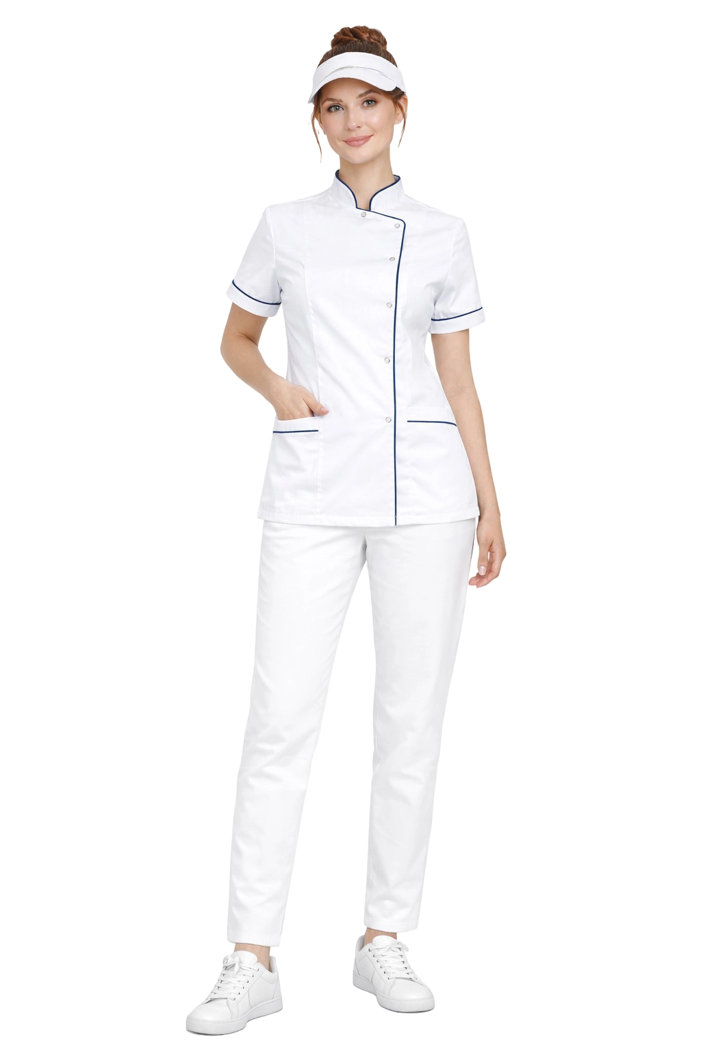 Naisten kokkisetti - Valkoinen esiliina tummansinisellä viimeistelyllä + sigaretti-tyyppiset housut