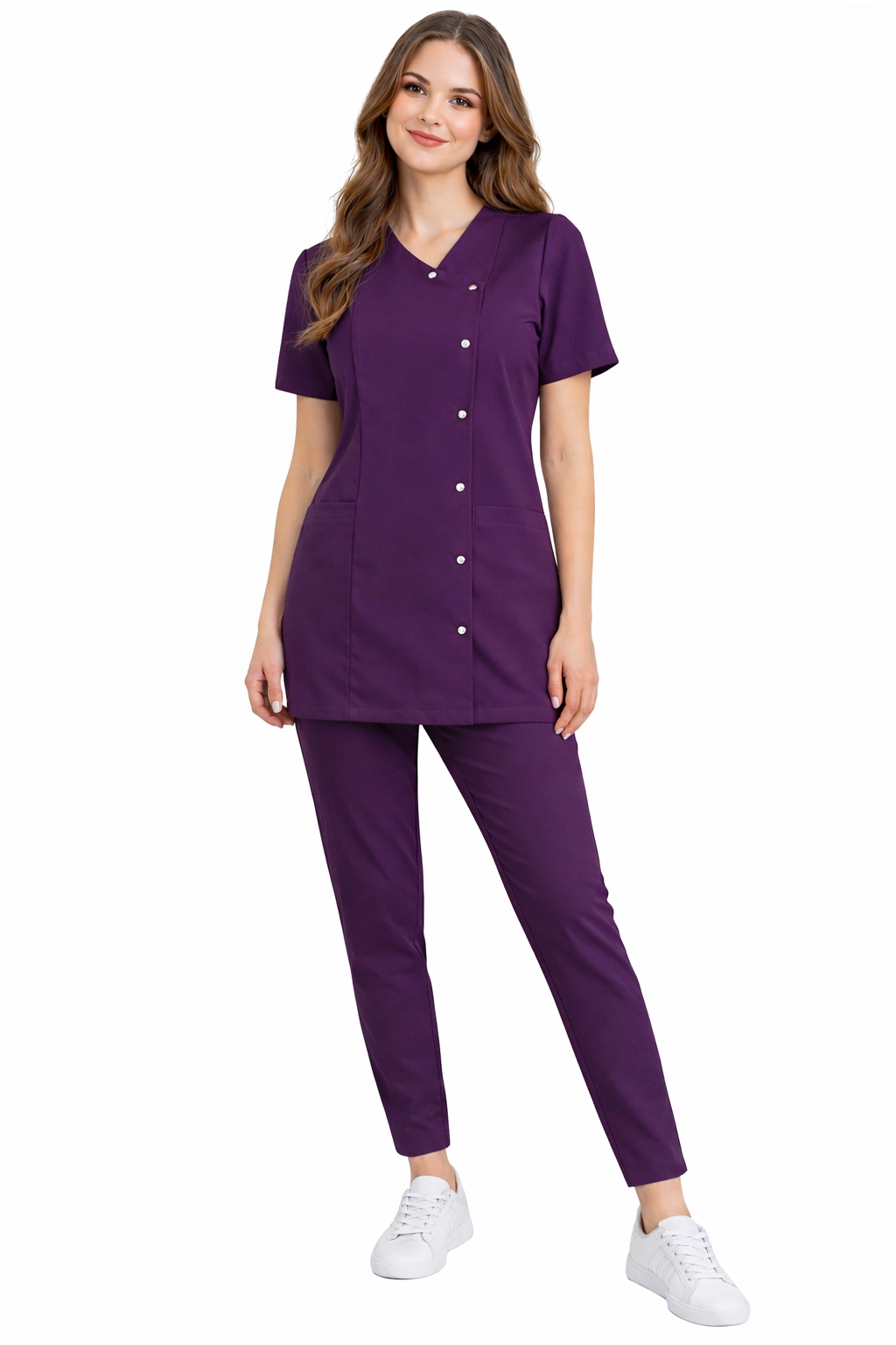 Naisten lääketieteellinen BASIC PREMIUM -setti violetissa värissä on tyylikäs ja toiminnallinen lääketieteellinen univormu, joka soveltuu sekä lääketieteellisiin että kosmeettisiin tarpeisiin. Setti sisältää BASIC PREMIUM lääketieteellisen takin ja BASIC PREMIUM lääketieteelliset housut, muodostaen mukavan ja ammattimaisen naisten scrubs-asun.