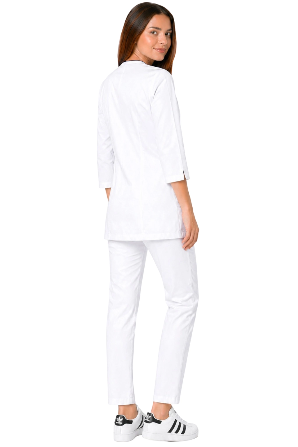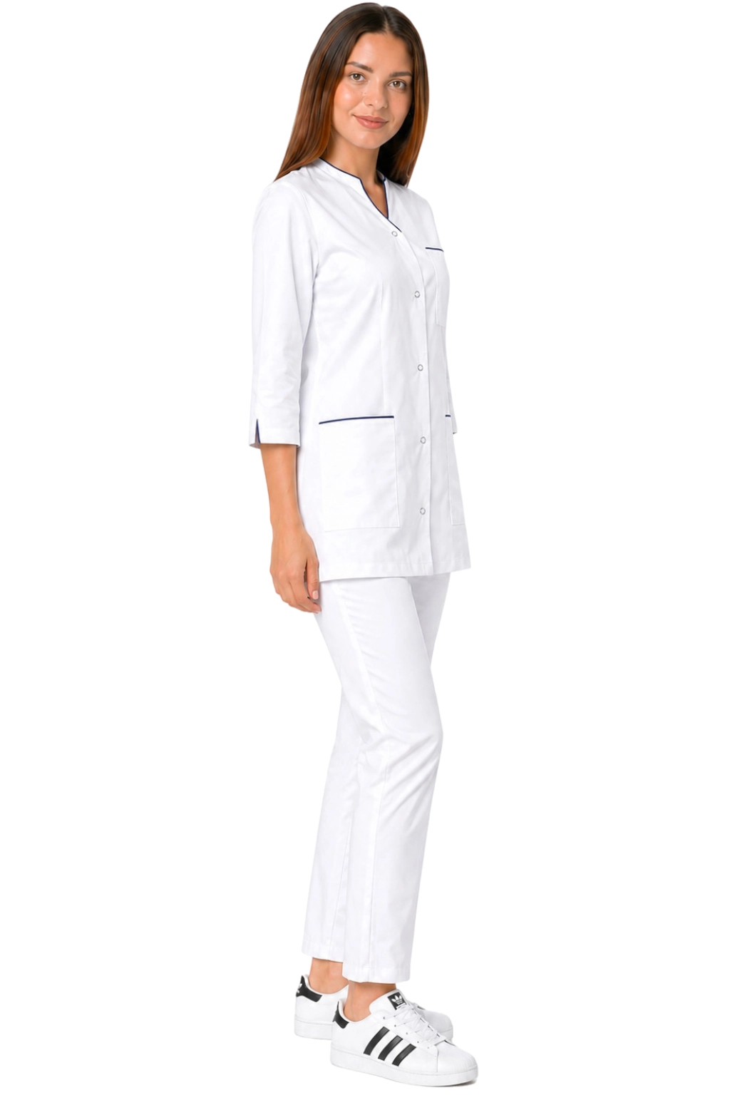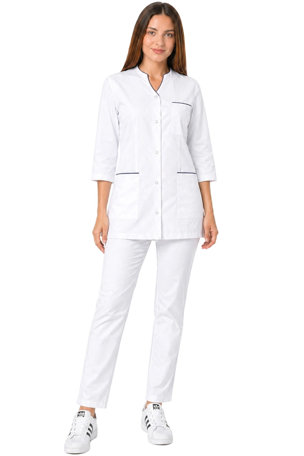 Naisten valkoinen lääketieteellinen setti tummansinisellä viimeistelyllä - 3/4-hihainen bleiseri ja PHARMACY COMFORT housut ovat erinomainen valinta lääketieteen ja kosmetologian ammattilaisille. Ainutlaatuinen settimme yhdistää tyylikkyyden ja toiminnallisuuden, tarjoten mukavuutta päivittäisessä työssä. Edestä napitettava bleiseri, jossa on esteettinen viimeistely, sovitetaan tyylikkäästi mukaviin caprihousuihin, jotka korostavat figuuri. Luotu ajatellen apteekkareita, farmaseutteja, optikkoja ja kirjauspäälliköitä, univormumme soveltuu myös sairaanhoitajille, kosmetologeille ja kampaamoille. Valitse mukava ja tyylikäs asu, joka helpottaa päivittäisiä haasteita!