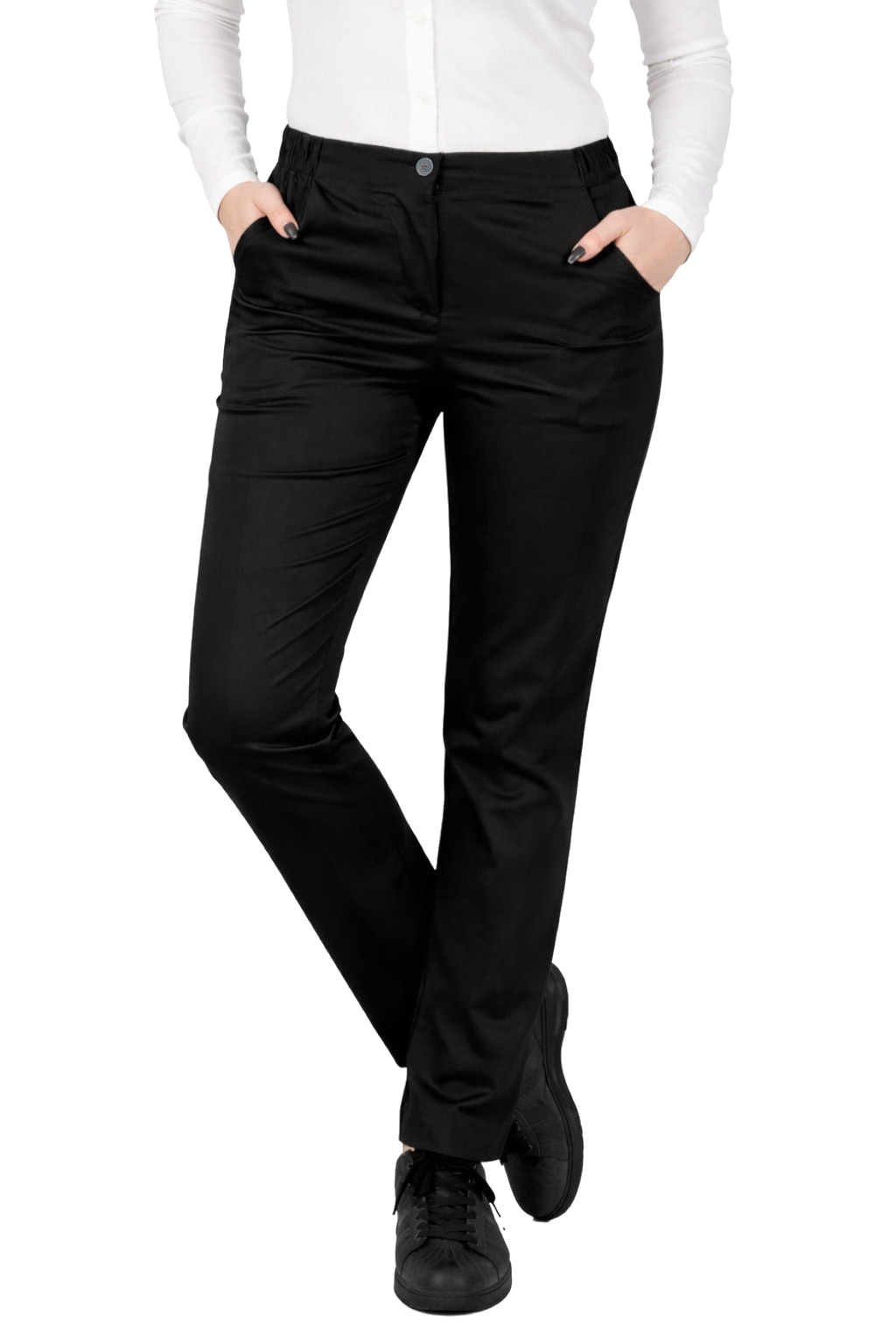 Naisten elastaanitarjoilijahousut ovat ihanteellinen valinta naisille, jotka työskentelevät ravintola- ja hotellialalla. Klassinen, rento leikkaus suoralla lahkeella tarjoaa ammattimaisen ulkonäön ja mukavuuden pitkien työtuntien aikana. Resorin, vetoketjun ja napin sisältävän joustavan vyötärönauhan ansiosta housut istuvat erinomaisesti ja takaavat mukavuuden ja liikkumisvapauden.