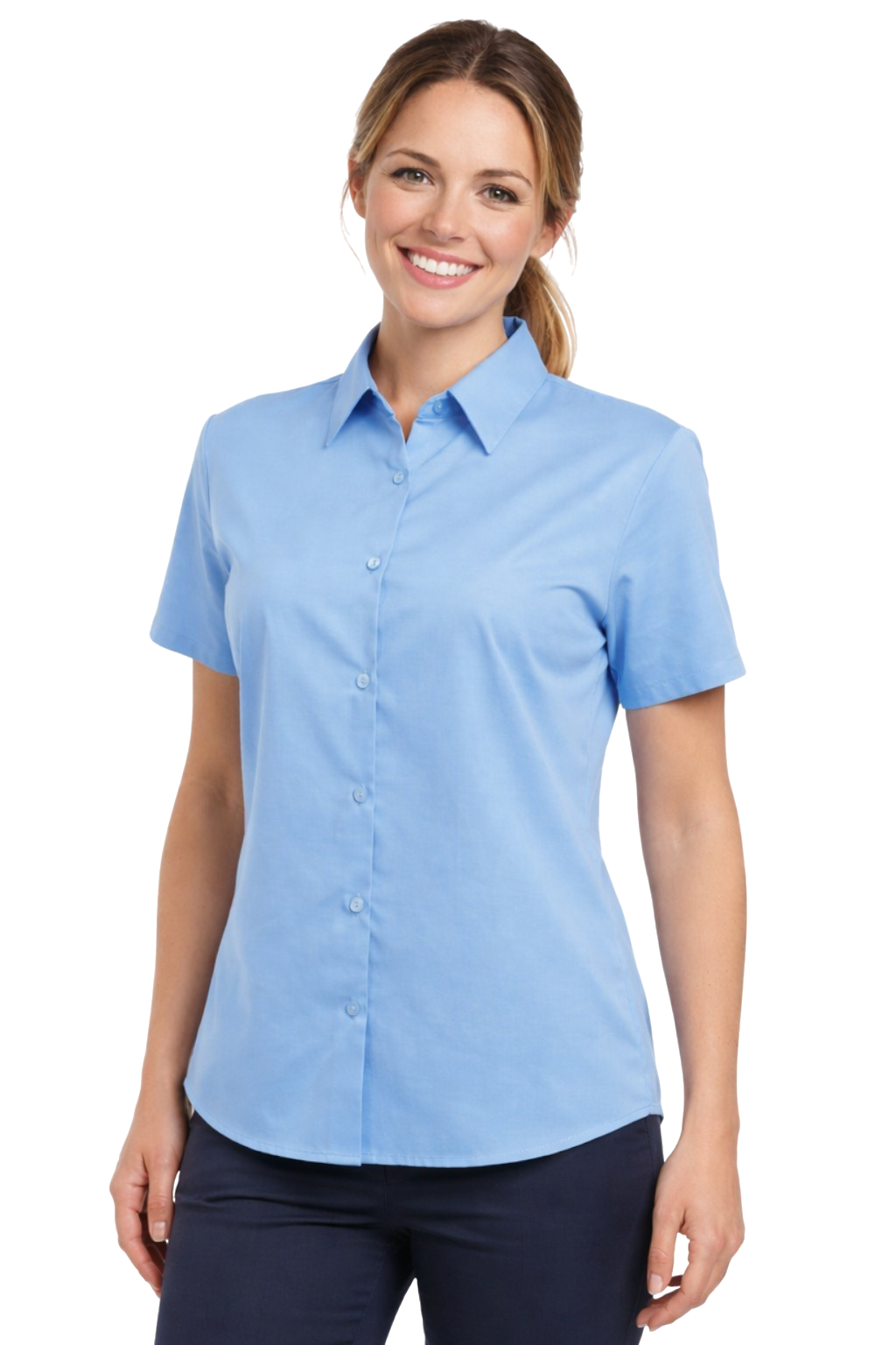 Naisten paita sininen lyhythihainen popliinista – tyylikkyys ja mukavuus työssä