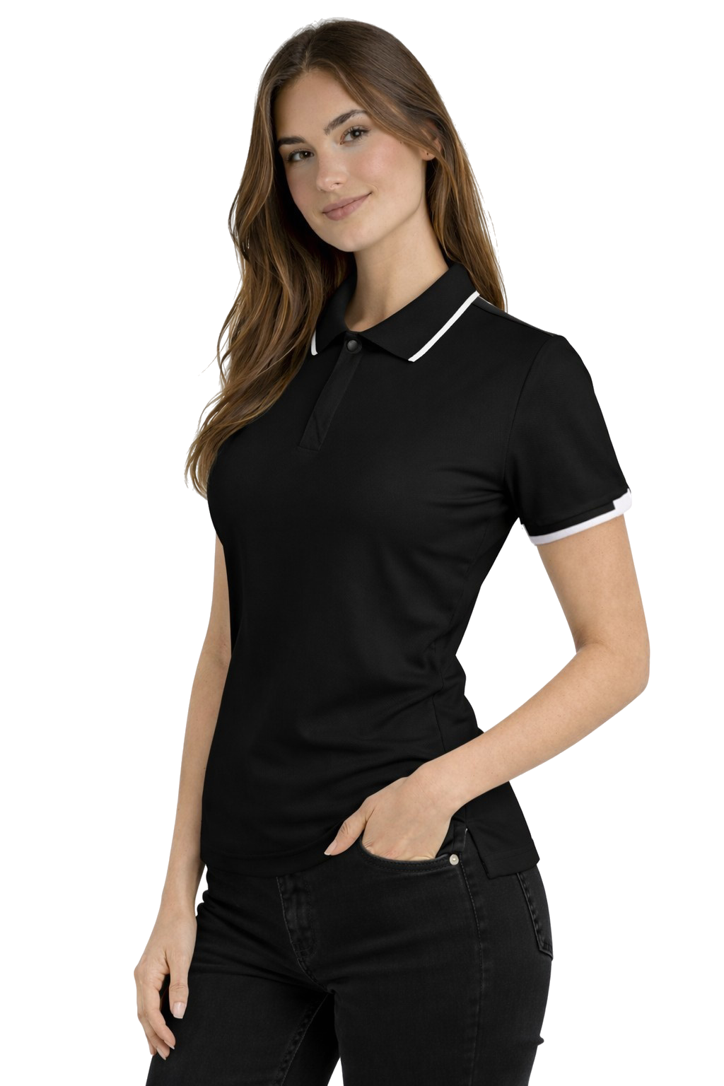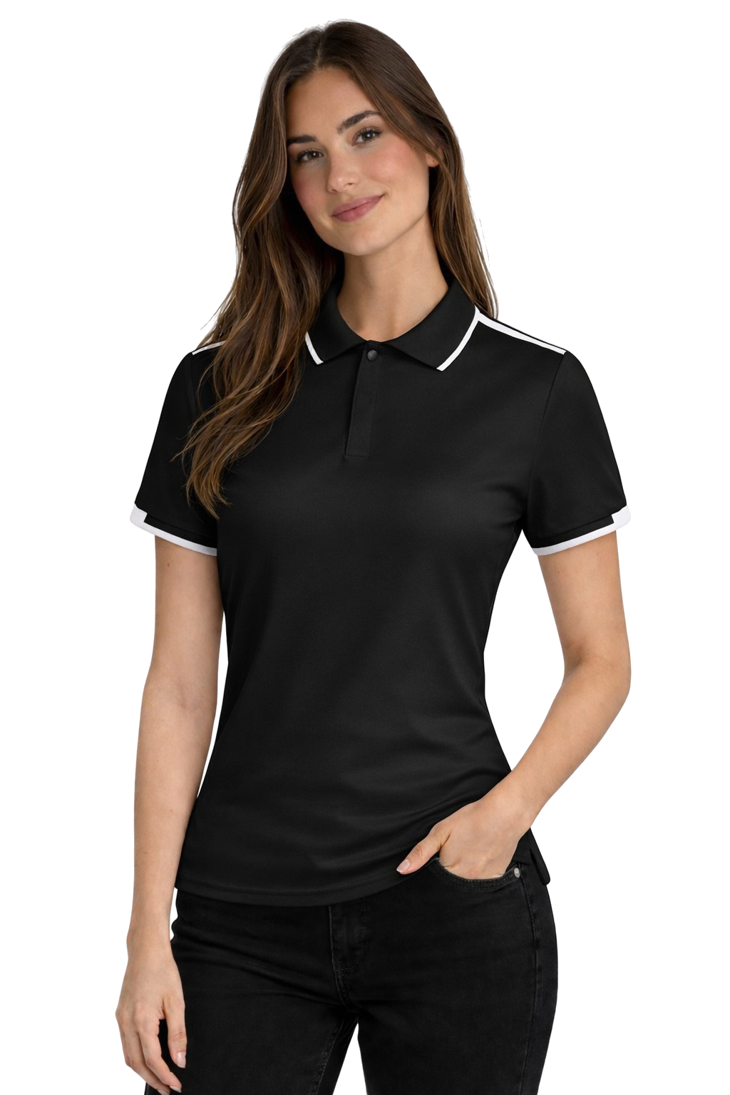 Naisten tyylikäs musta polo-paita valkoisilla yksityiskohdilla