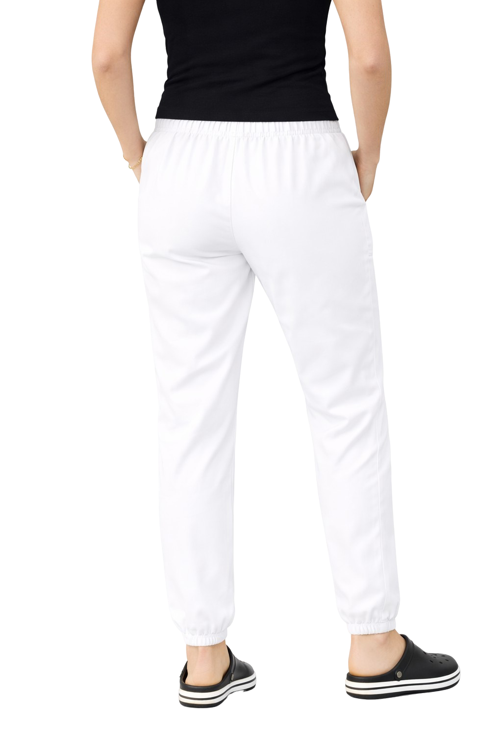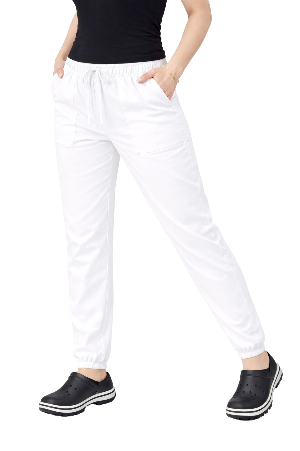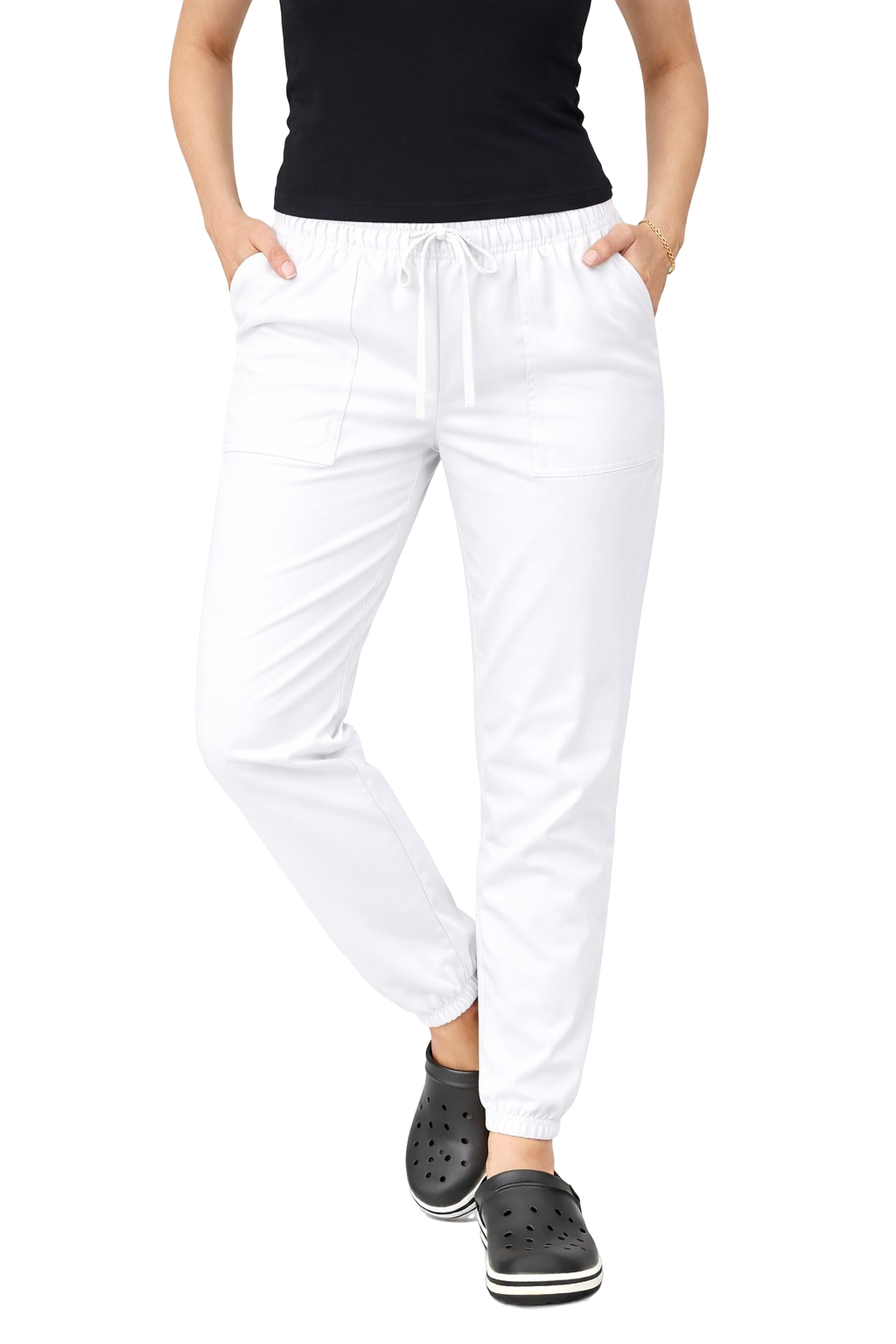Valkoiset naisten joggery ovat muodikkaan leikkauksen, mukavuuden ja kestävyyden yhdistelmä, jota jokainen gastronomia-alalla työskentelevä nainen arvostaa. Tämä on tällä hetkellä suosituin housumalli, joka erottuu urheilullisella luonteellaan ja modernilla ulkonäöllään. Housut sopivat erinomaisesti vartaloon mukavan kuminauhavyötärön ja kiristysnauhan ansiosta, takaten mukavuuden koko työpäivän ajan.