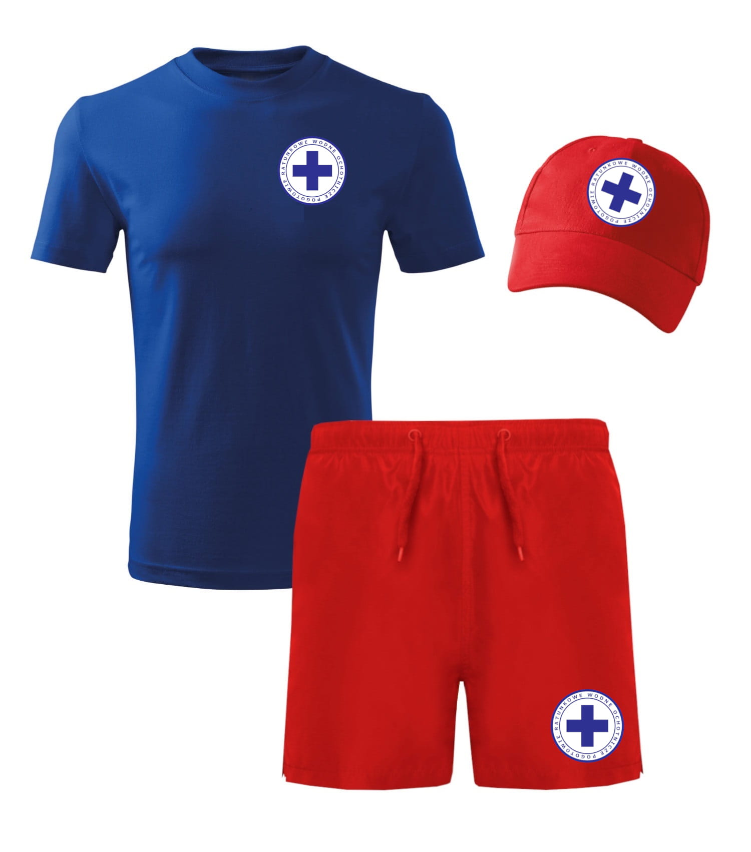 Lifeguard Kit on settimiehille, jotka työskentelevät uima-altailla, kylpylöissä, vesistöissä ja rannoilla. Pakkaus sisältää T-paidan, uimalakin, uimashortsit ja lämpöpainatuksella varustetun tuotemerkin, joten painatukset ovat pysyviä käytön ja veden kanssa kosketuksiin joutumisen aikana. Setti on valmistettu laadukkaista puuvilla- ja polyesterimateriaaleista, joten värit ovat kestäviä ja elinvoimaisia monien pesukertojen jälkeenkin.