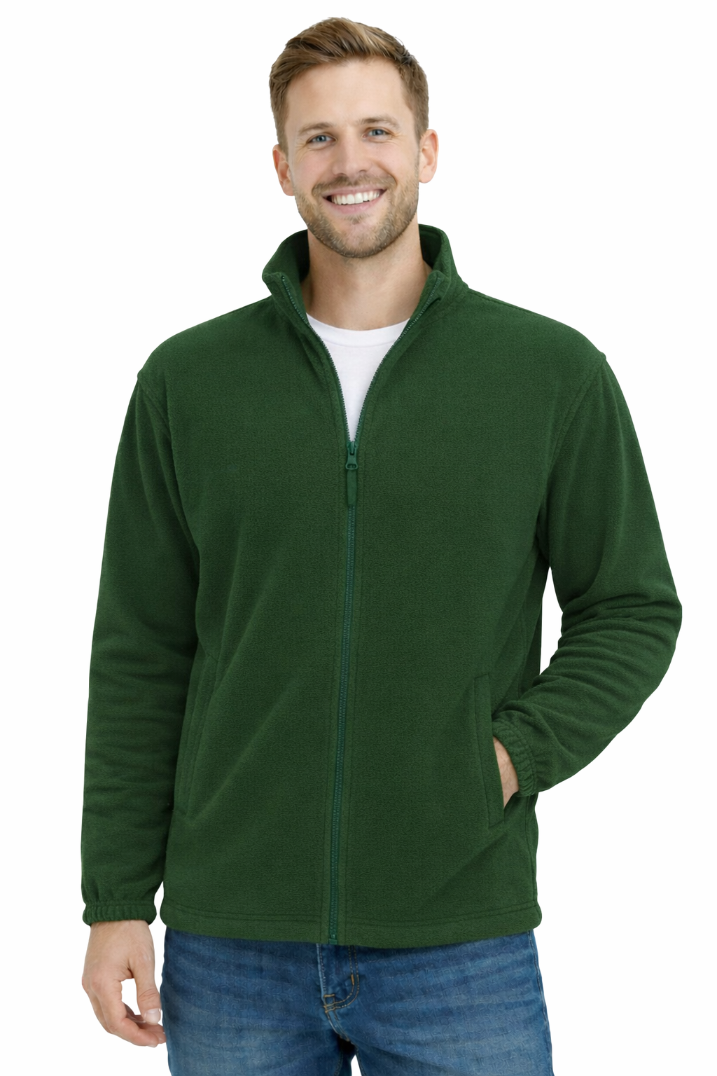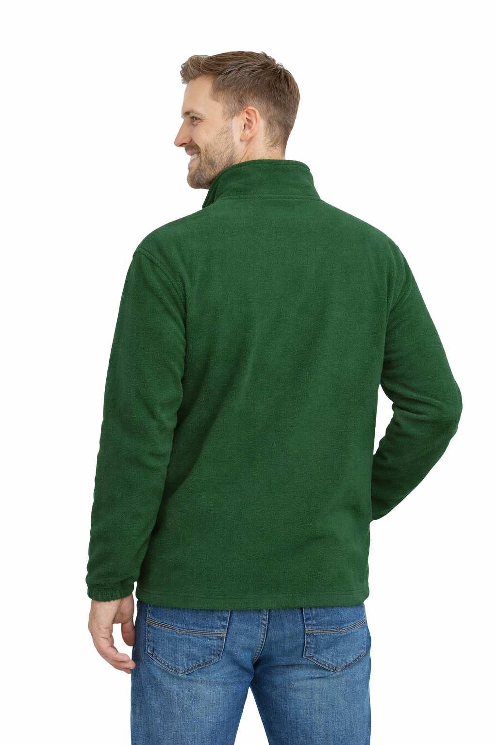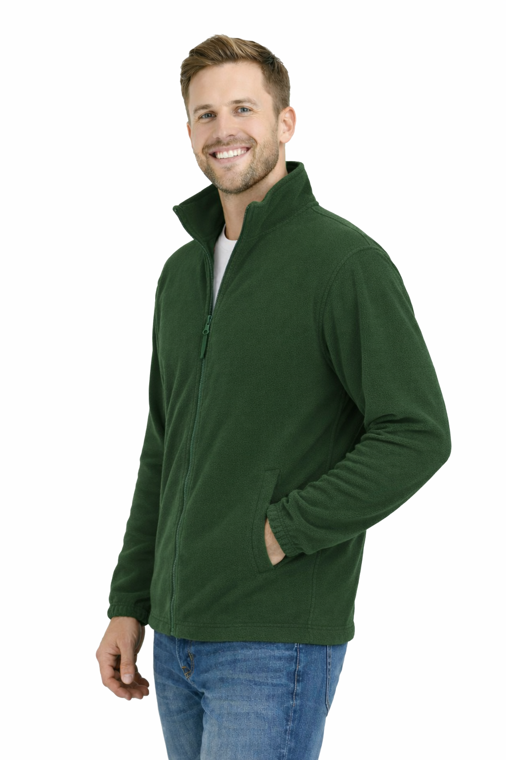 Lääkärintyössä käytettävä tummanvihreä miesten fleece-takki, jossa vetoketju