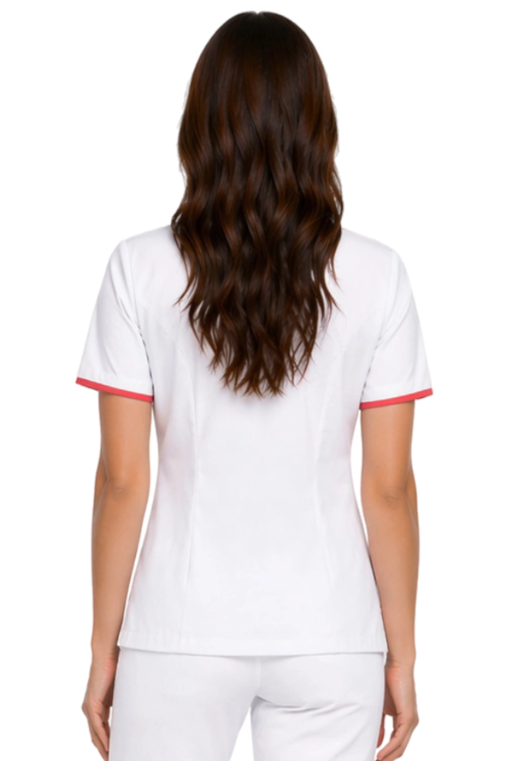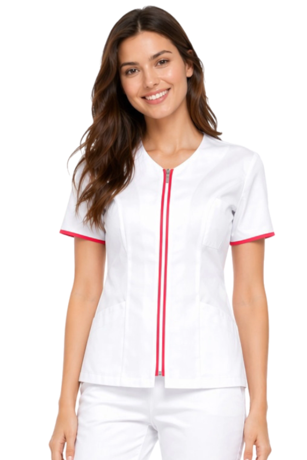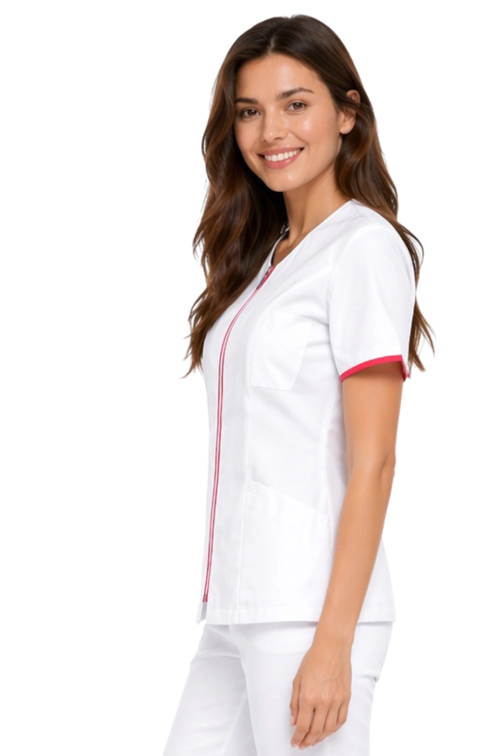 Tyylikäs Lääketieteellinen Takki valkoisena amarantin värijoustoilla on täydellinen yhdistelmä eleganssia ja toiminnallisuutta. Meidän COSMETIC-sarjan takit eivät ole vain työvaatteita, vaan myös muotitietoista pukeutumista, joka luo ystävällisen ja ammattimaisen vaikutelman työpaikalla.