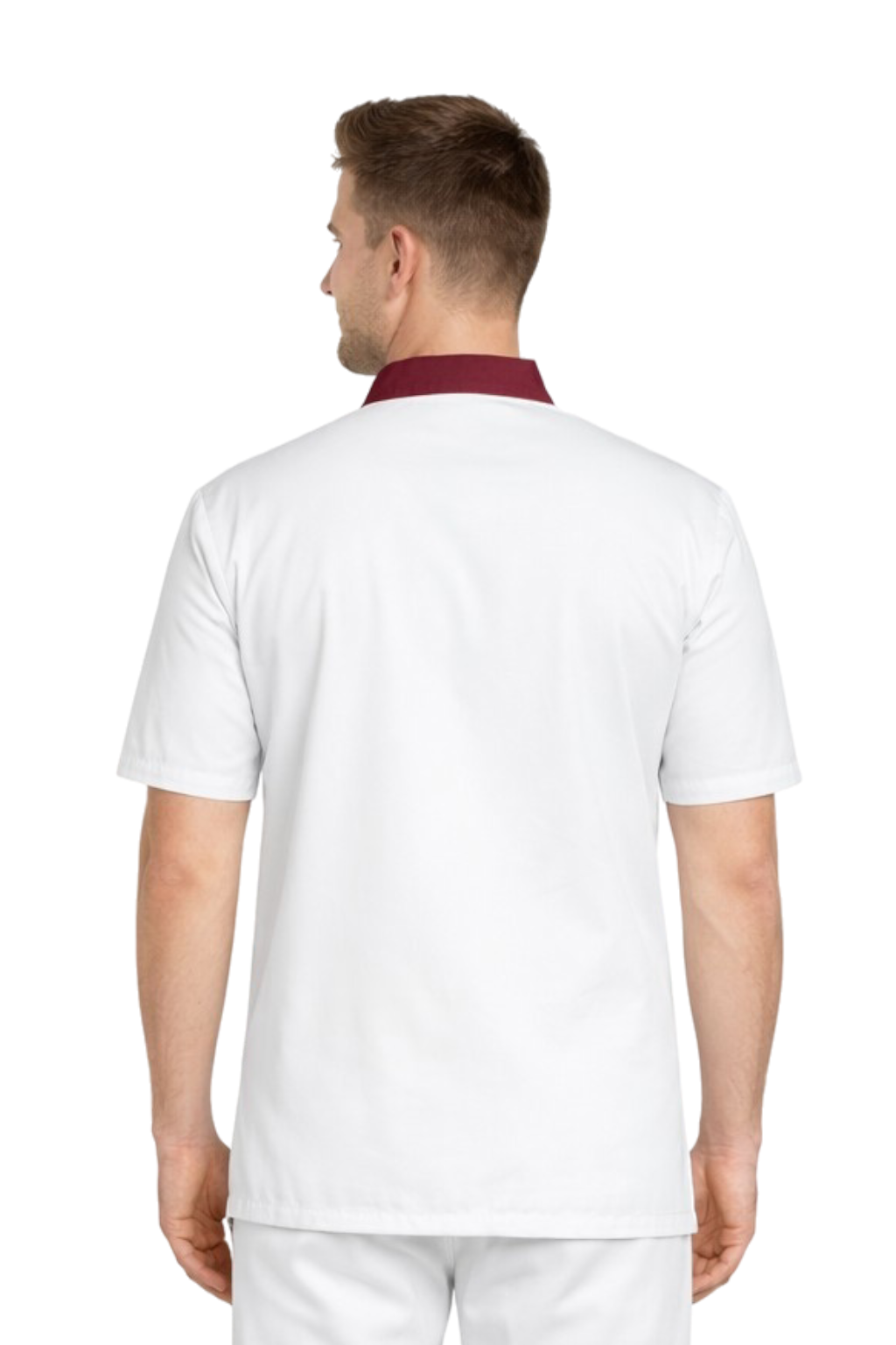 Miesten valkoinen kokinpaita, burgundinpunaisella kauluksella ja napeilla