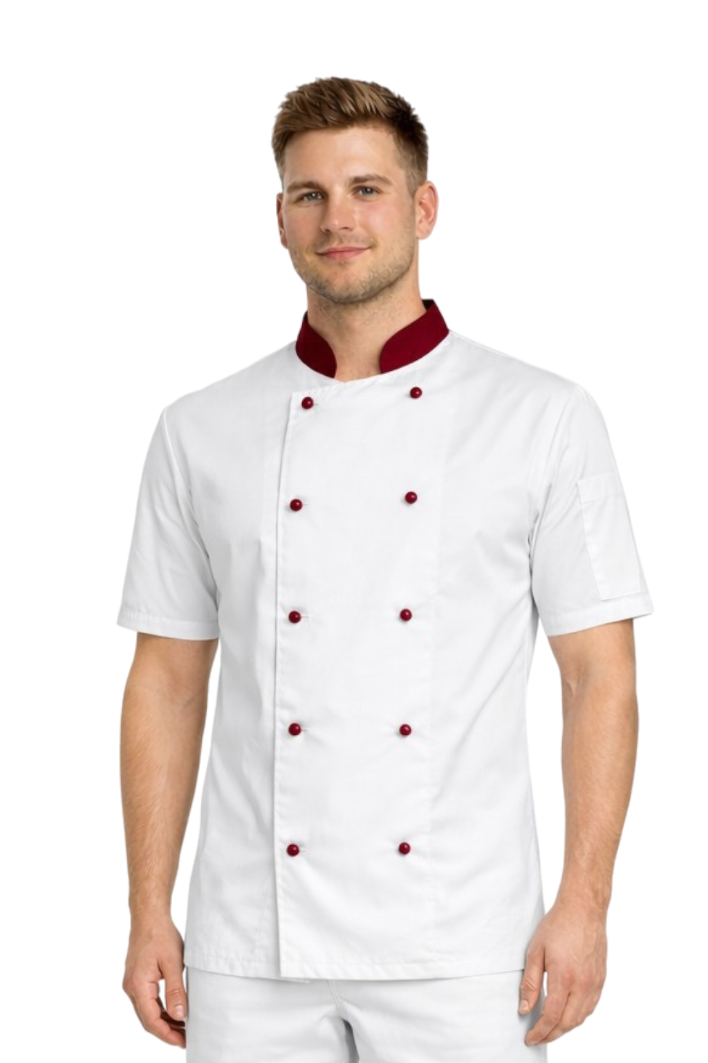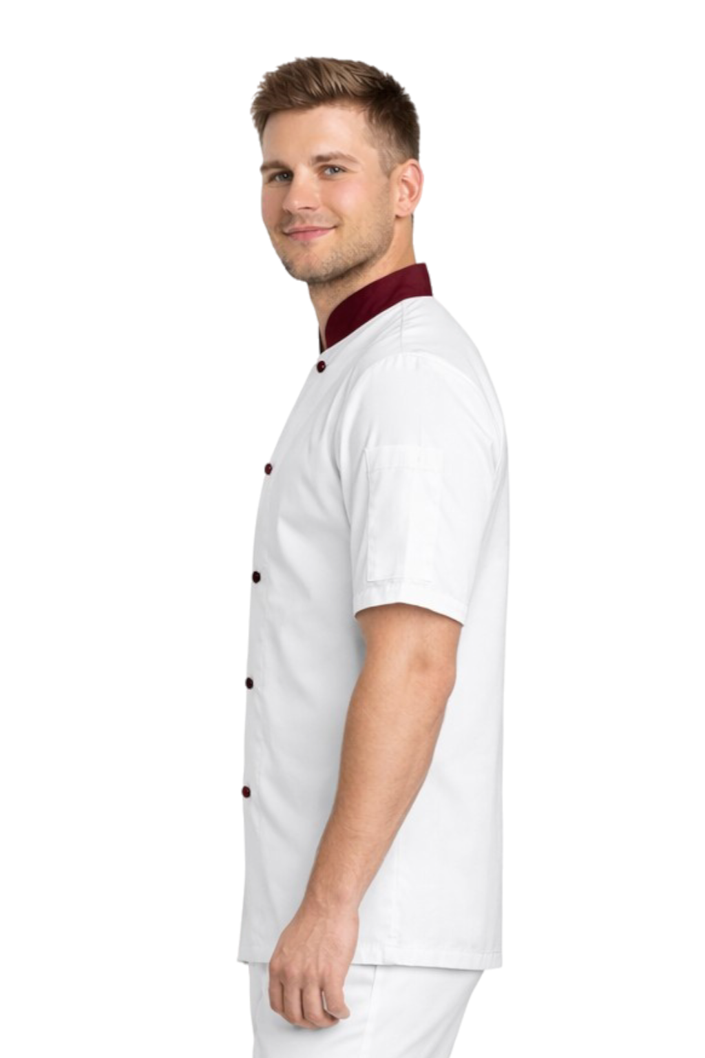 Valkoinen miesten keittiötakki burgundin värisellä kauluksella, napit – gastronominen takki, lyhyet hihat