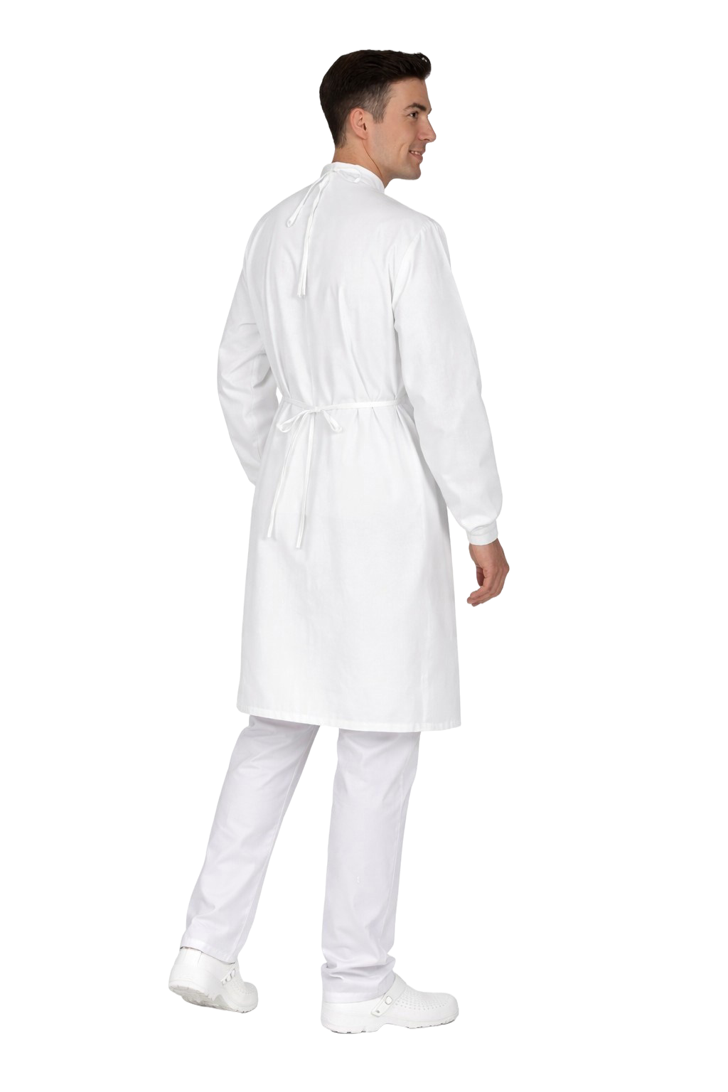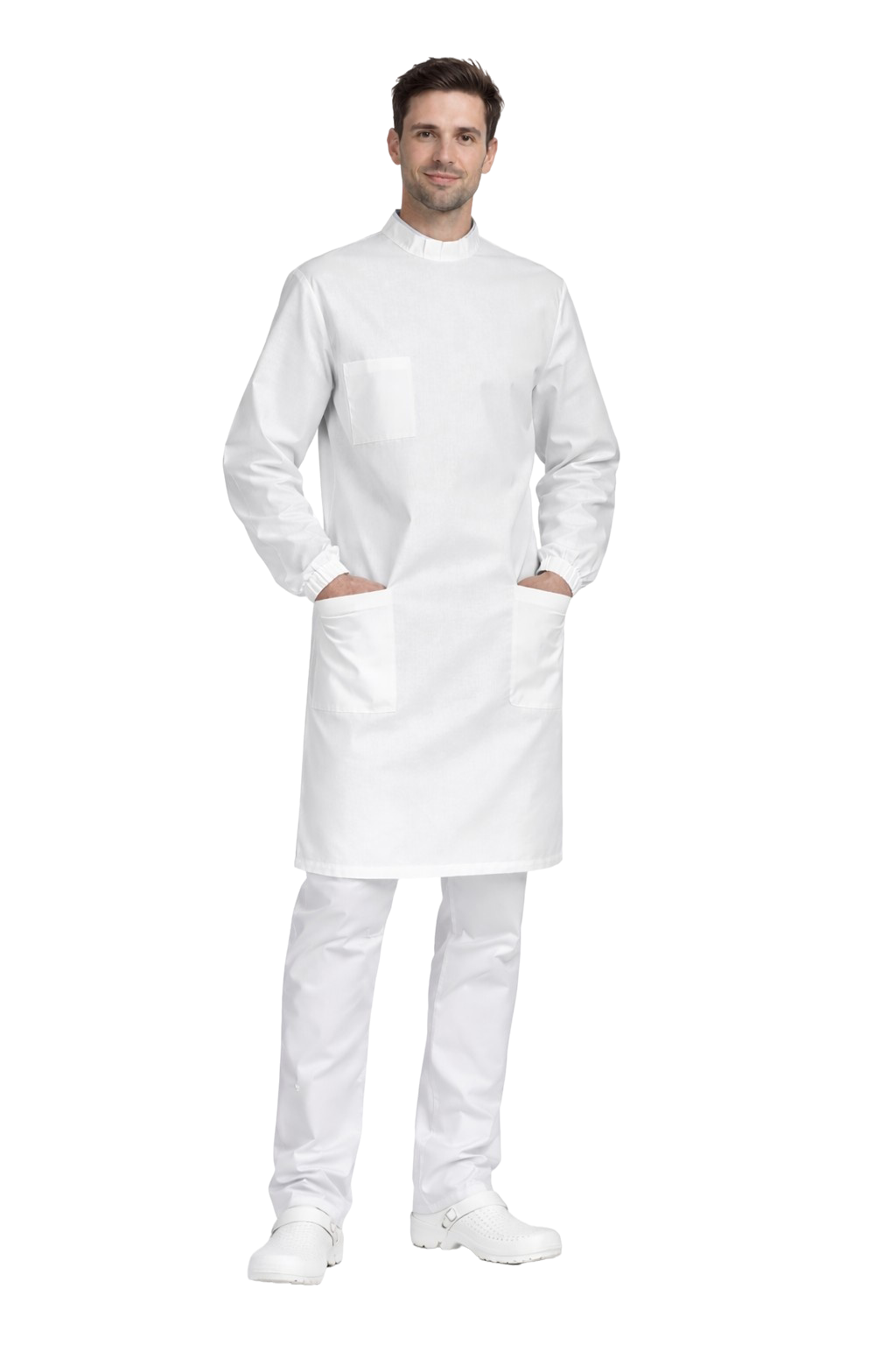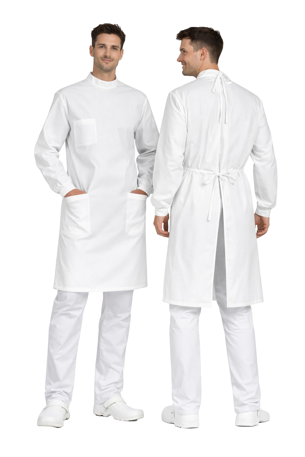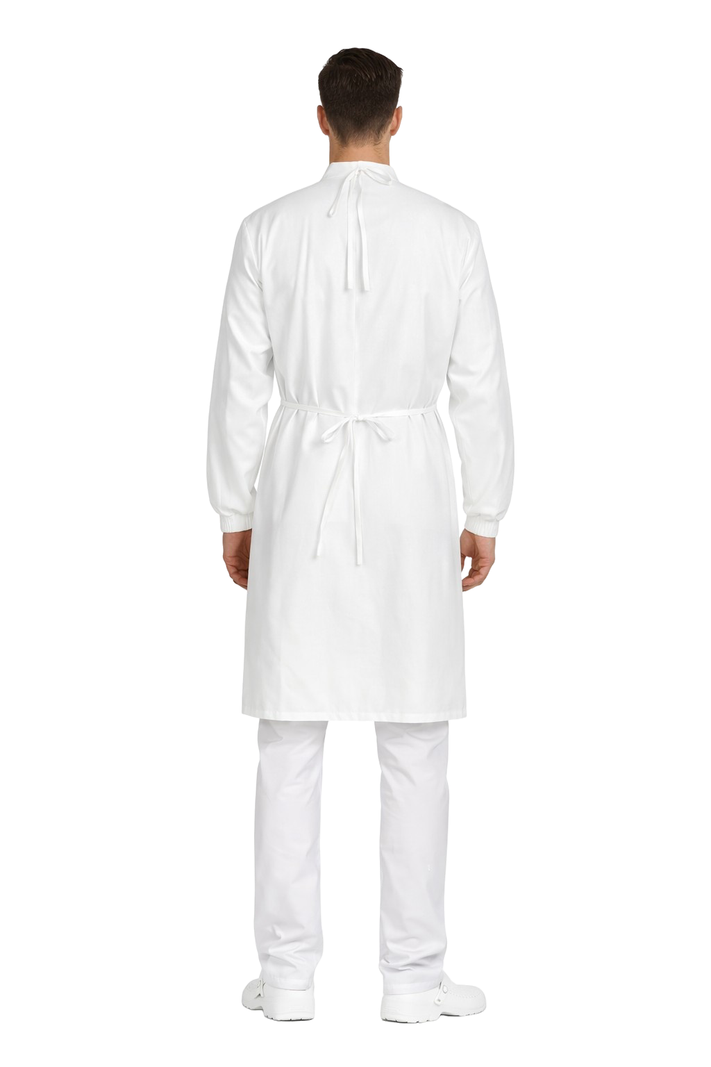 Valkoinen unisex-anatominen / ruumiinavausessu, jossa on taskut ja kaulus, 100% puuvillaa